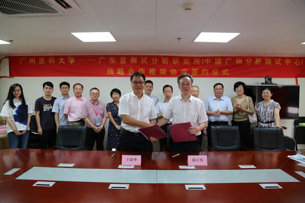 广医在线讯 7月9日下午,我校与广东省测试分析研究所(中国广州分析测试中心)战略合作框架协议签约仪式在我校越秀校区中西医结合研究所举行。广东省测试分析研究所领导陈江韩、李宏荣、曾耀东,我校校长王新华,以及双方相关部门负责人、专家参加活动。会议由我校中西医结合研究所副所长马红霞主持。