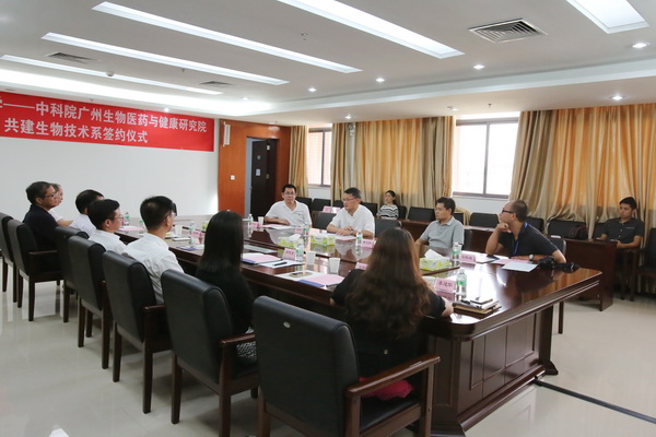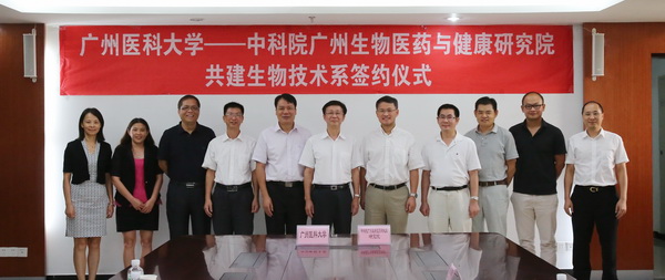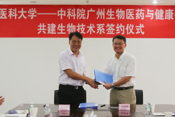 我校的精英教育探索又迎来了新平台、新机遇。7月16日,我校与与中科院广州生物医药与健康研究院(简称“广州生物院”)实现第三度合作,签署协议联合共建“生物技术系”,开展生物医药技术领域的卓越人才培养。广州生物院院长裴端卿,院长助理、华南干细胞与再生医学研究所副所长赖良学,院长助理潘光锦,科教处处长马乐诚,以及我校党委书记冉丕鑫、校长王新华、相关部门负责人等出席签约仪式。校长助理罗健东主持仪式。
