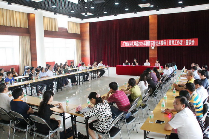 9月9日下午,我校在番禺校区召开迎2015年教师节暨优秀教师(教育工作者)座谈会。张雅洁副校长、人事处、教务处、工会、各学院负责人、党总支书记、附属单位分管人事领导、2015年南粤优秀教师、广州市优秀教师(教育工作者)、Beat365中文官方网站优秀教师(教育工作者)参加了会议。会议由张雅洁副校长主持。