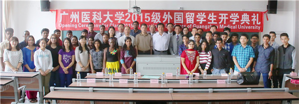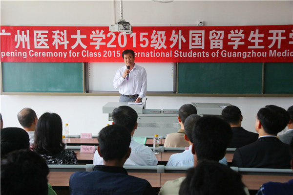 11月16日,2015级留学生开学典礼在番禺校区a3-404举行。王新华校长、陈杰副书记、魏东海副校长,以及国际教育学院、教务处、学生处、团委、附一院、附二院等相关二级单位及职能部门负责人、2015级留学生新生及在校生代表参加了开学典礼。开学典礼由魏东海副校长主持。