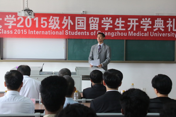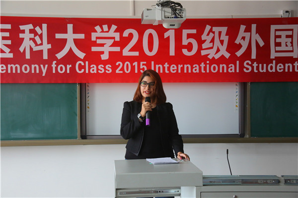 王新华校长首先代表学校对2015级外国留学生新生的到来表示欢迎和祝贺。他简要地介绍了学校的基本情况,他指出近年来学校国际化发展显著,留学生规模日益扩大,相信留学生们能够在这里度过一段充实的学习时光。他寄语外国留学生,希望他们能努力学习,在多元的国际化的学习环境中保有一颗包容之心,广交朋友,多请教老师,适应环境,努力让自己成为一名合格的医学留学生。
