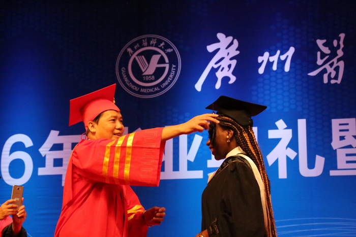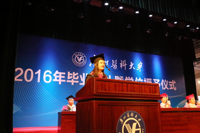 现场洋溢着温馨感动的气息。李叶梅同学讲到有的同学因为考试熬夜担心身体顶不住而要准备“硝酸甘油”、 sinclair mosha同学讲到第一次做青蛙实验不忍心“杀死”青蛙时,大家都发出会心的笑声。今年是我校首届留学生毕业,sinclair mosha先后用中文、“家乡话”、英语致辞。他们深情回忆在校学习的点滴,真挚感谢母校、老师的恩情和同学的友谊。“请始终把‘德’字摆在心的正中央”,杜宝玲老师从自己的父亲、一位从医60年的平凡而又有爱心的医生讲起,鼓励同学们做德才兼备的广医人。
