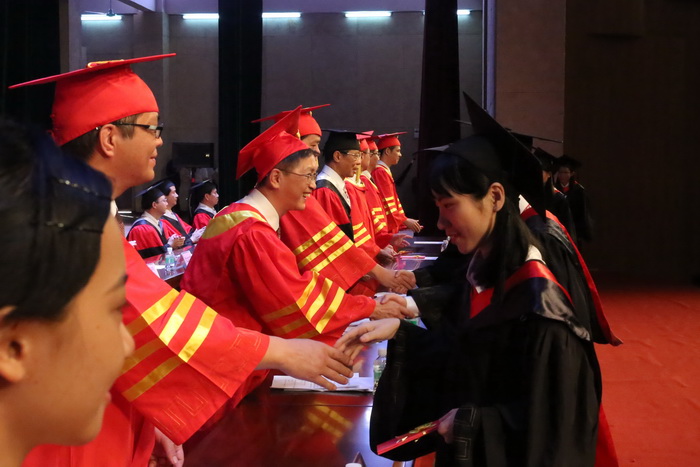 毕业典礼由副校长罗健东主持,副校长刘金保宣读优秀毕业生表彰决定及获奖名单,毕业生代表上台领奖。第二临床学院李叶梅同学和2010级留学生sinclair mosha同学、基础学院杜宝玲老师分别代表本科毕业生、毕业留学生和教师发言。