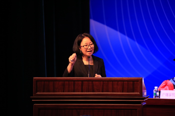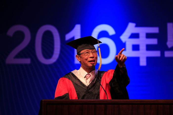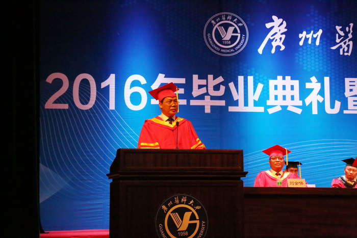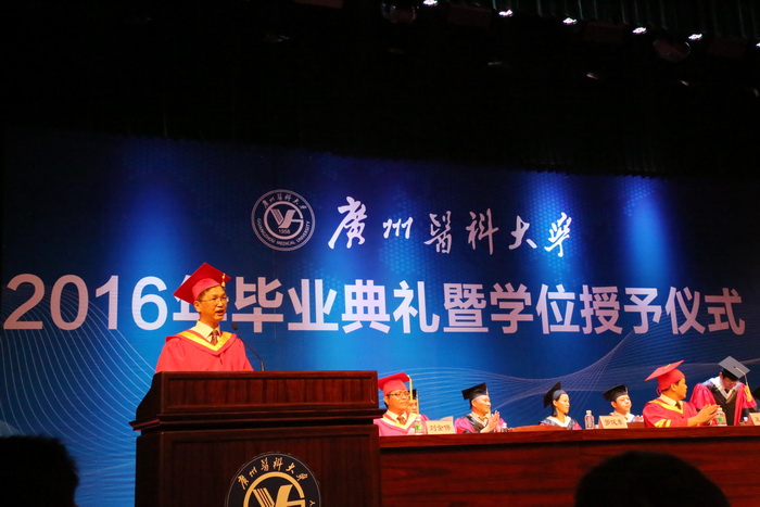 “今天是广医人一年一度最为盛大的节日,我们在这里欢聚一堂,为51位博士、560位硕士、1363位学士举行隆重的毕业典礼暨学位授予仪式。”王新华校长肯定了同学们在校期间取得的优异成绩和突出表现,感谢同学们对学校的理解、包容、支持与热爱。他以“夜空中最亮的星”为喻,希望同学们做梦想和信仰之星、创新和攀峰之星、大爱和奉献之星。他希望同学们把个人奋斗的理想与梦想融入到中华民族伟大复兴的中国梦,多学习中国历史,尤其是中国近现代史。多学习和弘扬中华文化,增强文化自信。还建议大家涉猎中医著作,把整体的、恒动的、平衡的和天人相应的观念融入职业生涯。他还以荣获第十一届光华工程科技奖成就奖的钟南山院士,在国际顶级期刊发表研究成果的附三院产科重大疾病重点实验室范勇博士研究团队,刚刚被评为“南粤百杰”、 其团队研究成果获2015年度国家科技进步奖二等奖的冉丕鑫教授,以及其他优秀学者为例,鼓励同学们要实现理想和目标,必须有坚韧不拔的意志和久久为功的毅力。“你们让广医的星空灿烂无比”, 最后,王校长祝福同学们踏上寻找真理、真心和真爱的旅程,充满积极、阳光的正能量,在今后的人生中找到“夜空中最亮的星”。