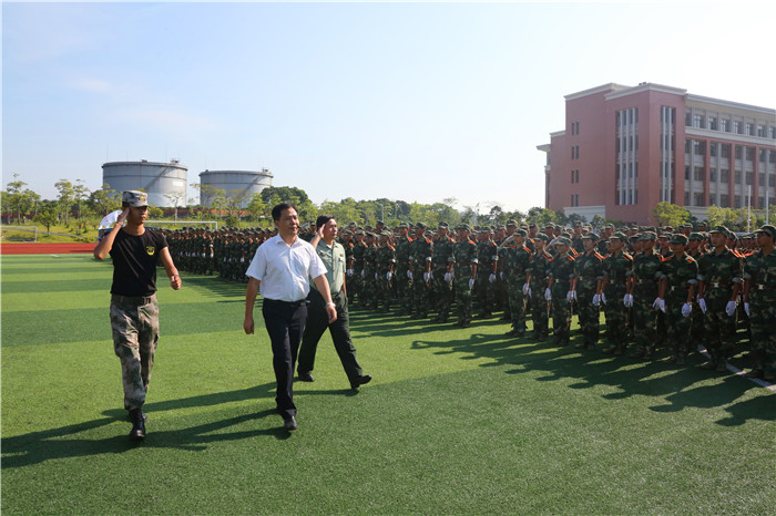 王新华校长在学校武装部部长的陪同下检阅各方队,并向参训同学致以亲切的问候,同学们口号响亮、步伐整齐、士气高昂。