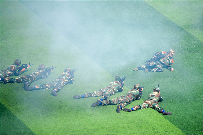 分列式表演精彩纷呈。2016级新生组成8个队列方阵依次接受检阅,他们精神抖擞、意气风发,嘹亮的口号声响彻整个体育场。经过15天军训历练,同学们以挺拔的军姿、铿锵的步伐展现了自身的精神风貌。随后进行的擒敌拳、反恐救护等军事表演气势如虹、震撼人心。
