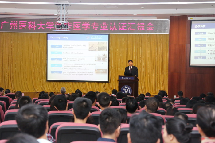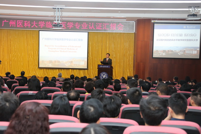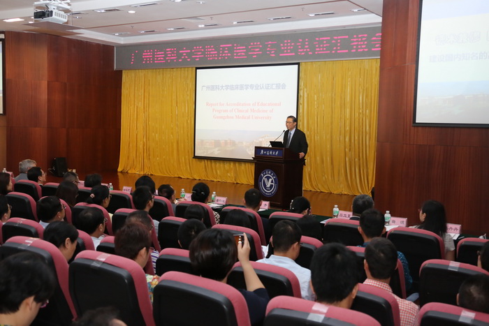 认证汇报会于7日上午在番禺校区图书馆报告厅举行。学校党委书记冉丕鑫致欢迎辞,钟南山院士简介了临床医学专业尤其是南山班的教学改革情况,专家组组长David Ellwood教授主持认证会,校长王新华作汇报。广州市教育局副巡视员邵国良、广州市卫计委科教处处长夏海晖出席会议。我校全体校领导、部分教职工和学生代表参加了会议。