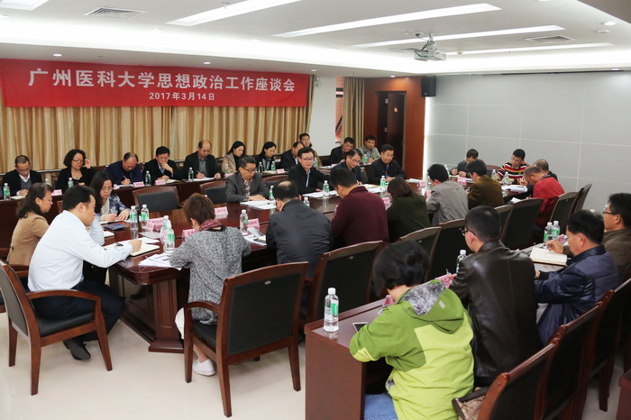 3月14日下午,我校思想政治工作座谈会在番禺校区行政楼举行。学校党委书记冉丕鑫、副书记陈晓辉,各职能部门负责人,各党总支和直属党支部书记、专职副书记,各学院院长,思想政治理论课教学部负责人,以及各附属医院党委正副书记、分管教学工作副院长参加了本次会议。
