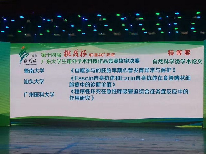 在刚结束的第十四届“挑战杯”广东大学生课外学术科技作品竞赛终审决赛上,我校第三临床学院2012级本科生潘龙为负责人的团队作品《程序性坏死在呼吸窘迫综合征炎症反应中的作用研究》荣获特等奖。这是我校历年来收获的第7个省“挑战杯”特等奖,也是自2009年以来连续五届获此殊荣。