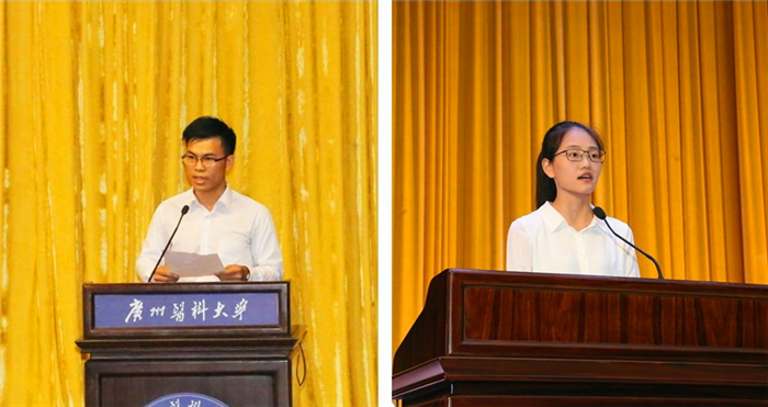博士研究生邓葵淼同学、第一临床学院蔡贝贝同学分别代表研究生新生、本科生新生发言,表达了对广医的赞美与热爱:广医虽“小”,但潜力甚“大”,广医有着独特与浓厚的文化底蕴,可以成就“我们”的人生。他们表达了对大学生活的展望与期待,对投身医学事业的梦想与追求:在师长的引领下,做有温度会思考的广医人,无所畏惧地踏上实现梦想的征途。