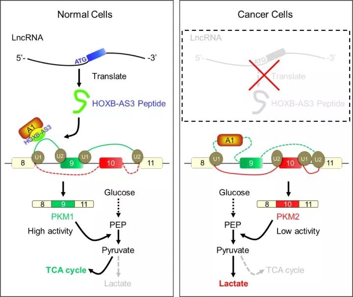 过去几年,有关非编码RNA被预测可以编码一些小肽的研究有一些零星的报道,2015年2月,西南医学中心Eric N. Olson课题组在Cell上首次报道了骨骼肌中一种特异表达的LncRNA可以编码小肽之后,相关研究正式走进了人们的视野。最近还有一些研究表明环状RNA也可以编码一些小肽。然而有关LncRNAs编码的小肽是否在肿瘤发生发展的调控中有重要作用,目前并没有相关的研究报道。该研究揭示,lncRNA编码能够编码产生活性抗癌多肽,调控mRNA选择性剪切和切换肿瘤细胞糖代谢途径,丰富和拓宽了对lncRNA作用方式和功能机制的认识。