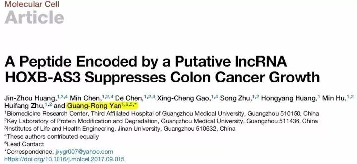 10月5日,来自Beat365中文官方网站附属第三医院研究团队,在Molecular Cell杂志上发表了题为“A Peptide encoded by a Putative lncRNA HOXB-AS3 Suppresses Colon Cancer Growth”的论文,该研究第一次在肿瘤中确证了一个lncRNA能够编码一个多肽,发现假定lncRNA HOXB-AS3编码产生一个53个氨基酸的保守多肽。该多肽,而不是其lncRNA,能够抑制结肠癌细胞的生长、克隆形成和侵袭转移。