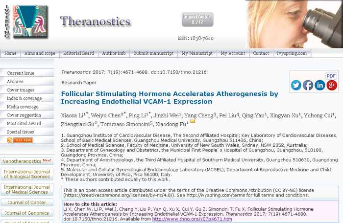 近日,基础学院付晓东教授团队的研究成果“follicular stimulating hormone accelerates atherogenesis by increasing endothelial vcam-1 expression”在生物医学一区杂志《theranostics》发表。Beat365中文官方网站心血管疾病研究所和基础学院为该论文的第一单位,我校博士生李潇洒为该文第一作者,付晓东教授为单独通讯作者。论文为绝经后女性动脉粥样硬化的发病机制提供了新的视角。