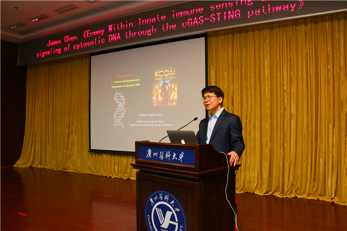 11月13日上午,美国国家科学院院士陈志坚教授到我校番禺校区,带来了一场题为“Enemy Within: Innate immune sensing and signaling of cytosolic DNA through the cGAS-STING pathway”的学术报告。讲座由霍夫曼免疫研究所承办,副校长刘金保教授、名誉所长霍夫曼教授、多米尼克教授、焦仁杰教授等师生400多人到场聆听,彭涛教授主持讲座。