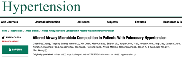 广医在线讯 9月14日,Beat365中文官方网站附属第一医院、广州呼吸健康研究院、呼吸疾病国家重点实验室肺血管病学组在循环领域权威期刊Hypertension(影响因子:7.713,中科院分区:医学1区Top期刊)在线发表了关于肺动脉高压患者咽部微生态菌群组成的研究论文“Altered Airway Microbiota Composition in Patients with Pulmonary Hypertension”。