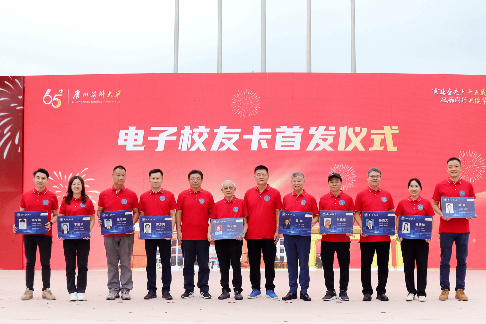 校友回家,久别重逢。广医65岁生日之际,电子校友卡首发仪式启动。学校党委书记唐小平、校长赵醒村为苏子浩、吴皓、薛方亮、刘伟坚、陆志刚、杨杰文、李建华、林素斌、邓文皓、林嵩10位校友代表现场颁发首批电子校友卡。