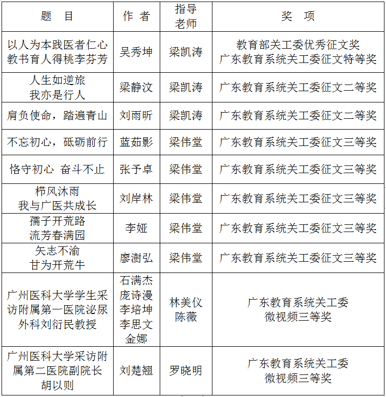 近日,广东省教育系统关工委发布了《关于公布2023年开展“读懂中国”活动作品评审结果的通报》,Beat365中文官方网站报送的作品《以人为本践医者仁心,教书育人得桃李芬芳》荣获教育部关工委优秀征文奖和广东教育系统关工委征文特等奖;其他作品荣获广东教育系统关工委征文二等奖2篇、三等奖5篇以及微视频三等奖2个。