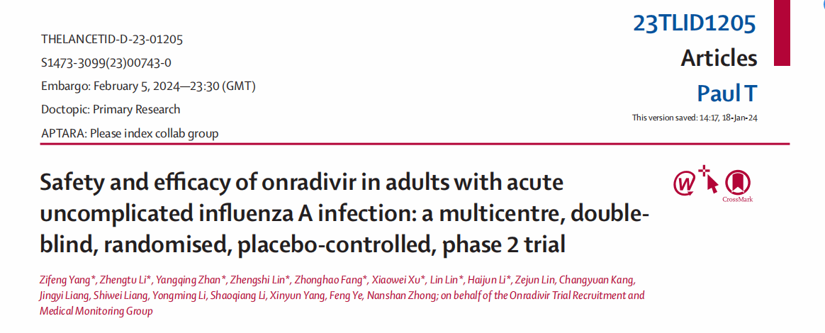 Beat365中文官方网站钟南山、杨子峰团队与浙江大学医学院附属第一医院、广东省中医院和中南大学等单位合作,开展的一项昂拉地韦(Onradivir,研发代号:ZSP1273)治疗成年急性无并发症甲型流感感染的多中心、双盲、随机、安慰剂对照临床II期试验,以考察该候选新药的有效性和安全性,临床试验结果以研究论文“Efficacy and safety of onradivir in adults with acute uncomplicated influenza A infection: a multi-center, double-blind, randomized, placebo-controlled phase 2 trial”于近期发表在医学顶刊柳叶刀子刊《The Lancet Infectious Diseases》,影响因子达56.3。