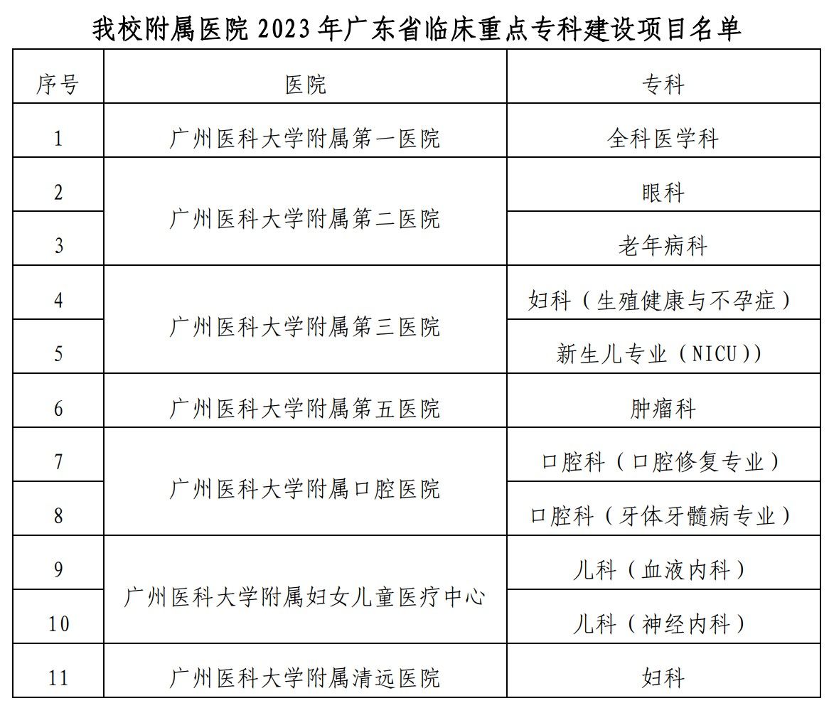 根据《广东省卫生健康委办公室关于公布2023年广东省临床重点专科建设项目的通知》,我校附属医院共有11个专科获评2023年广东省临床重点专科建设项目。