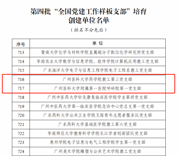 近日,教育部办公厅公布了第四批全国党建工作示范高校、标杆院系、样板支部培育创建单位名单。我校药学院教工第三党支部及附属第一医院呼研院第一党支部入选“全国党建工作样板支部”培育创建单位名单,成为我校首批入选“全国党建工作样板支部”的创建单位。