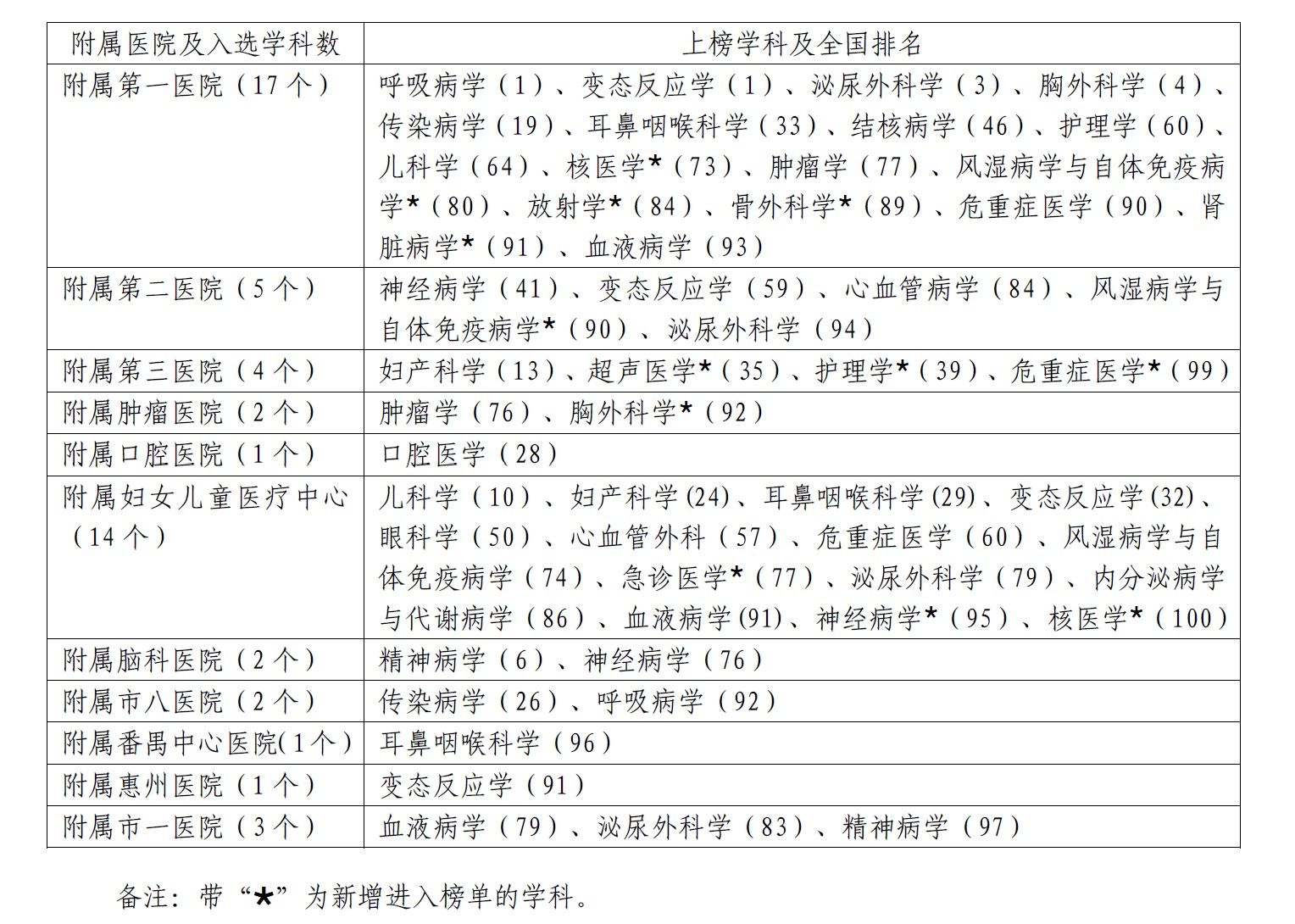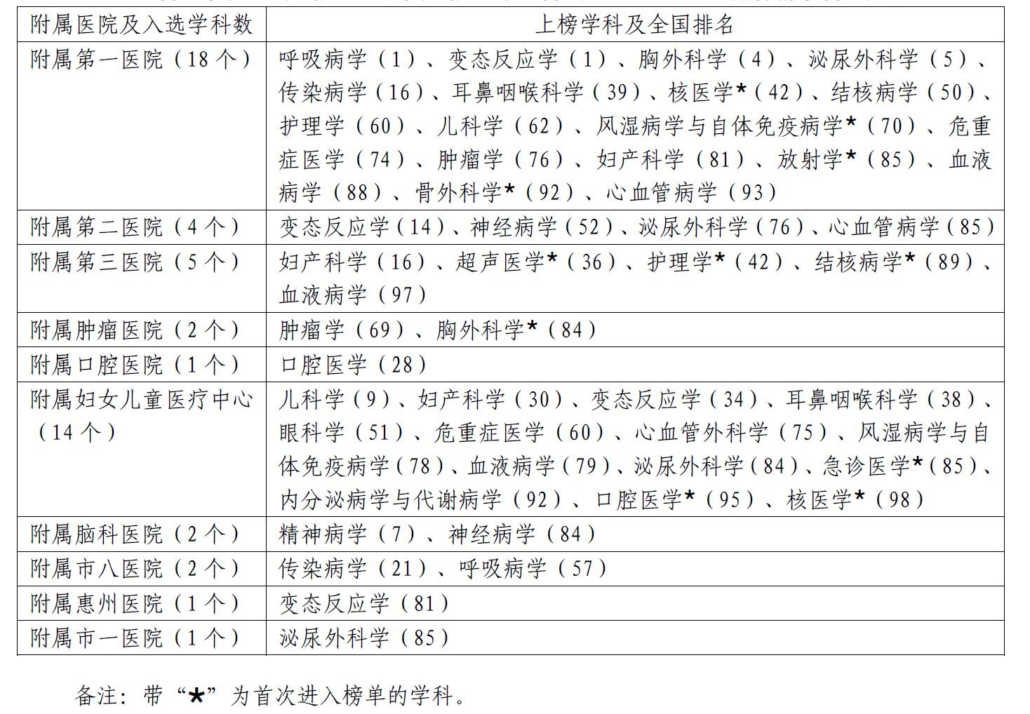 其中,附属第一医院呼吸病学持续排名全国第1位,变态反应学由去年排名全国第3位升至第1位,胸外科学排名全国第4位,泌尿外科学排名全国第5位;附属脑科医院精神病学排名全国第7位;附属妇女儿童医疗中心儿科学排名全国第9位(详见表2)。