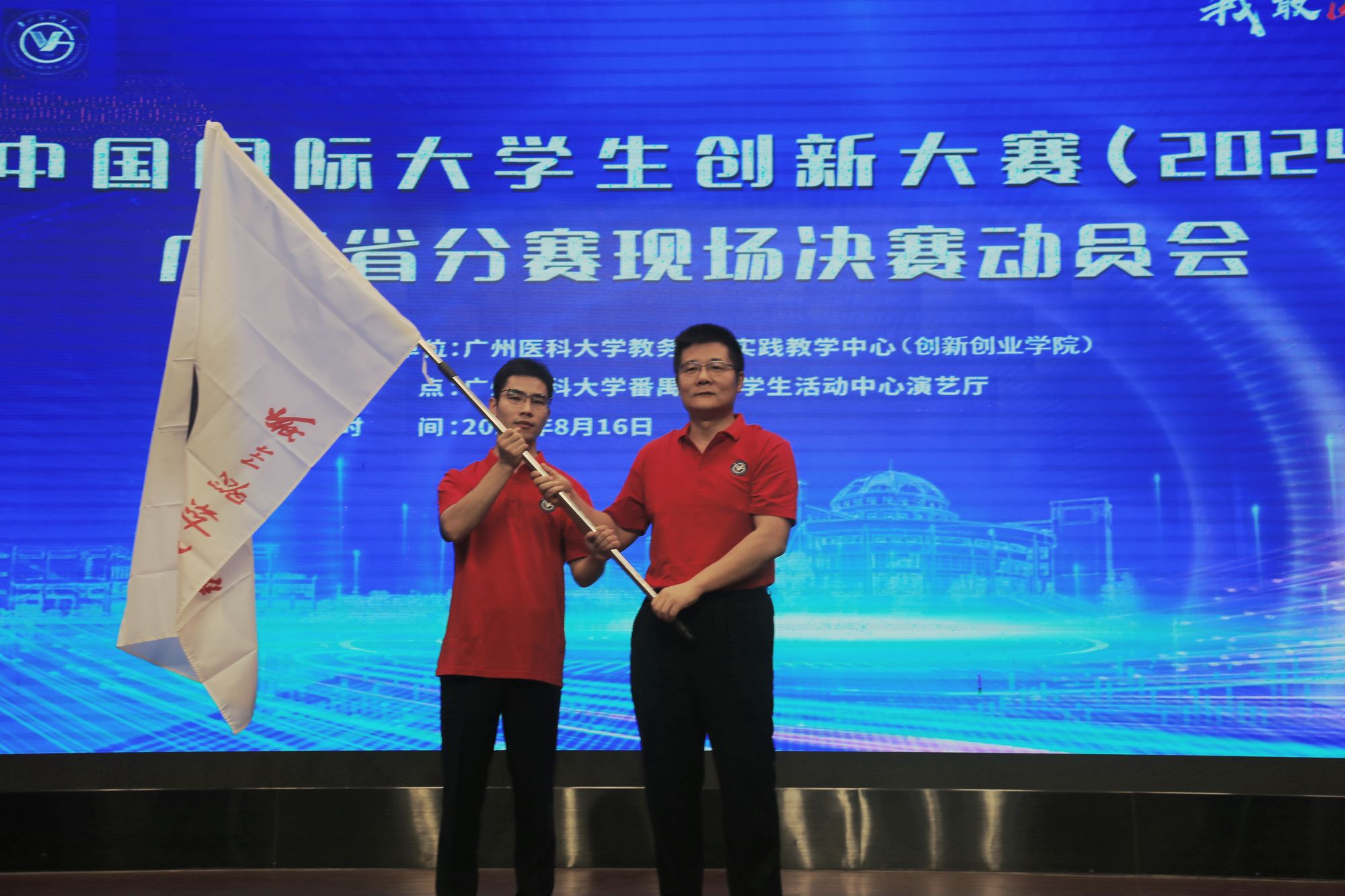 赴湛江参赛前,学校召开动员会。校长赵醒村为学生代表2023级博士研究生张振佳同学授旗。副校长李建华在动员讲话时鼓励同学们带着学校的期望,走得更高、走得更远。