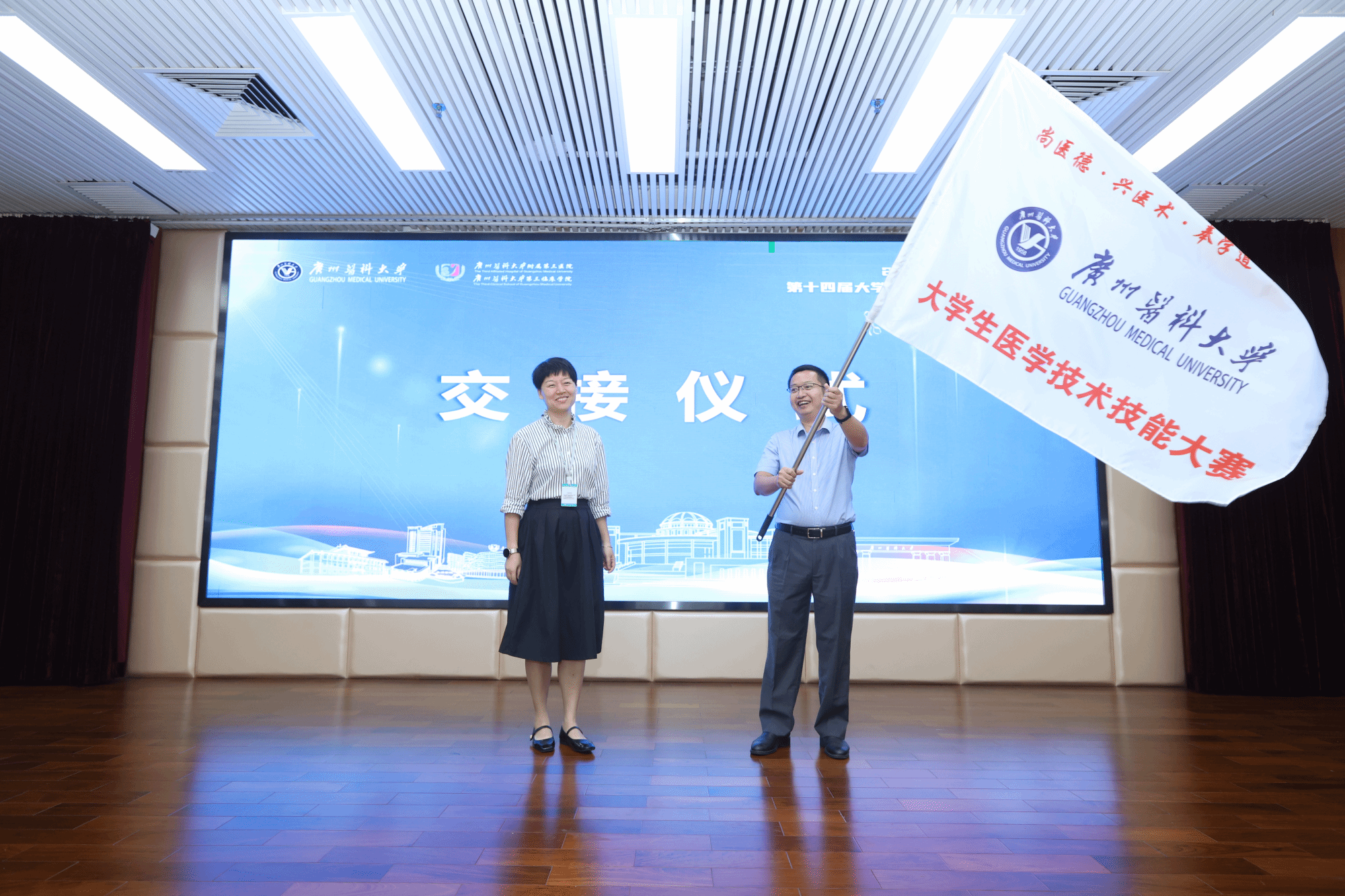 活动现场还举行了交接仪式,第六临床学院作为下一届大赛的承办单位,从第三临床学院手中接过学校大学生医学技术技能大赛的旗帜。