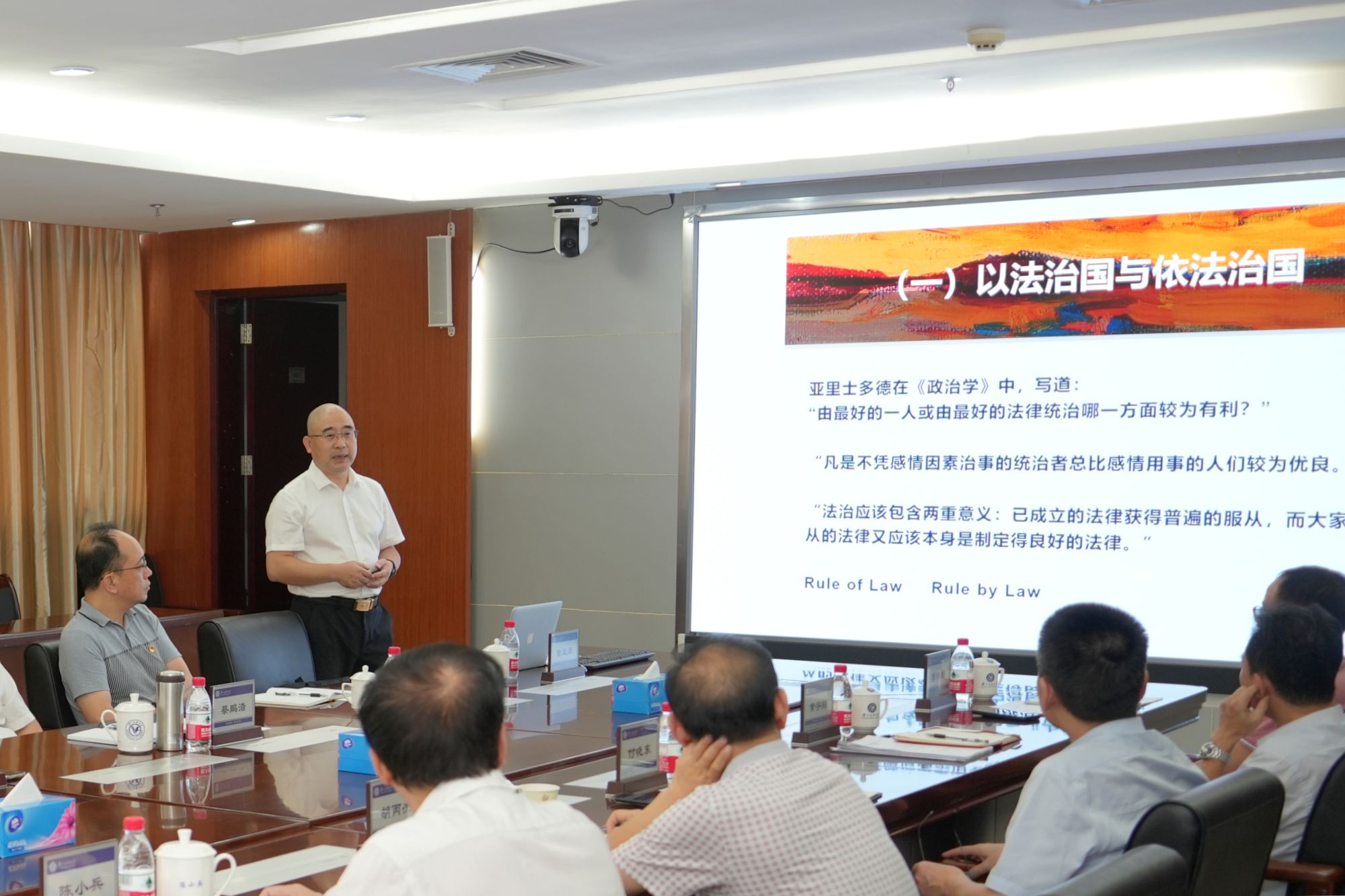 学校党委常委、副校长陈小兵、付晓东分别以“深刻理解习近平法治思想核心要义,坚持运用法治思维和法治方式推进依法治校,扎实开展法治宣传教育”和“深刻把握习近平法治思想精髓要义,深入践行总体国家安全观,守牢校园安全稳定底线”为题,分享了学习心得体会。