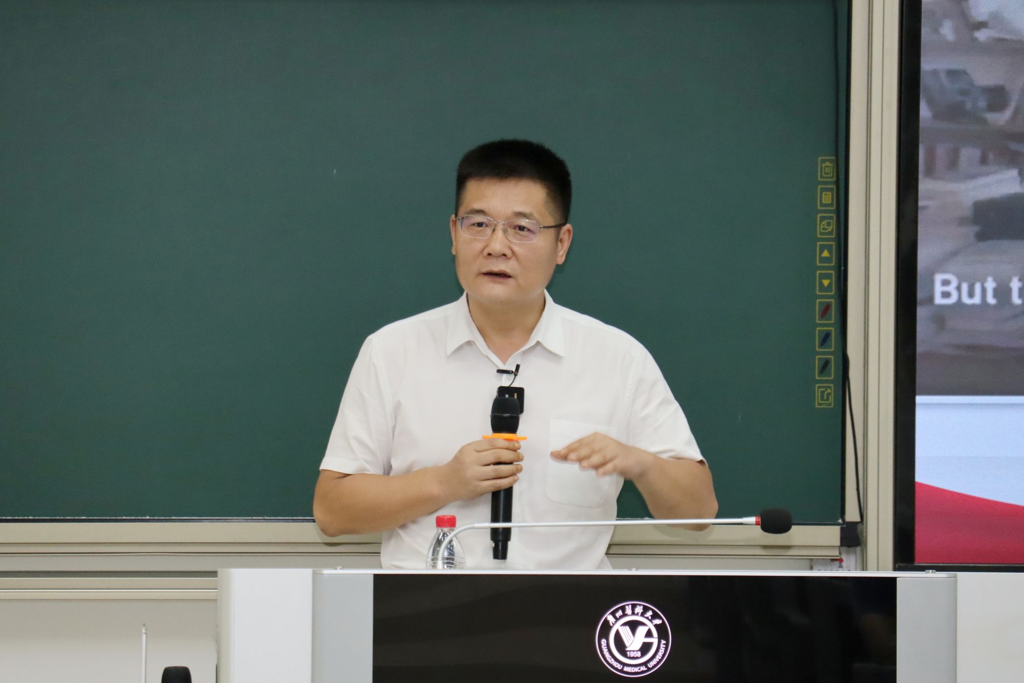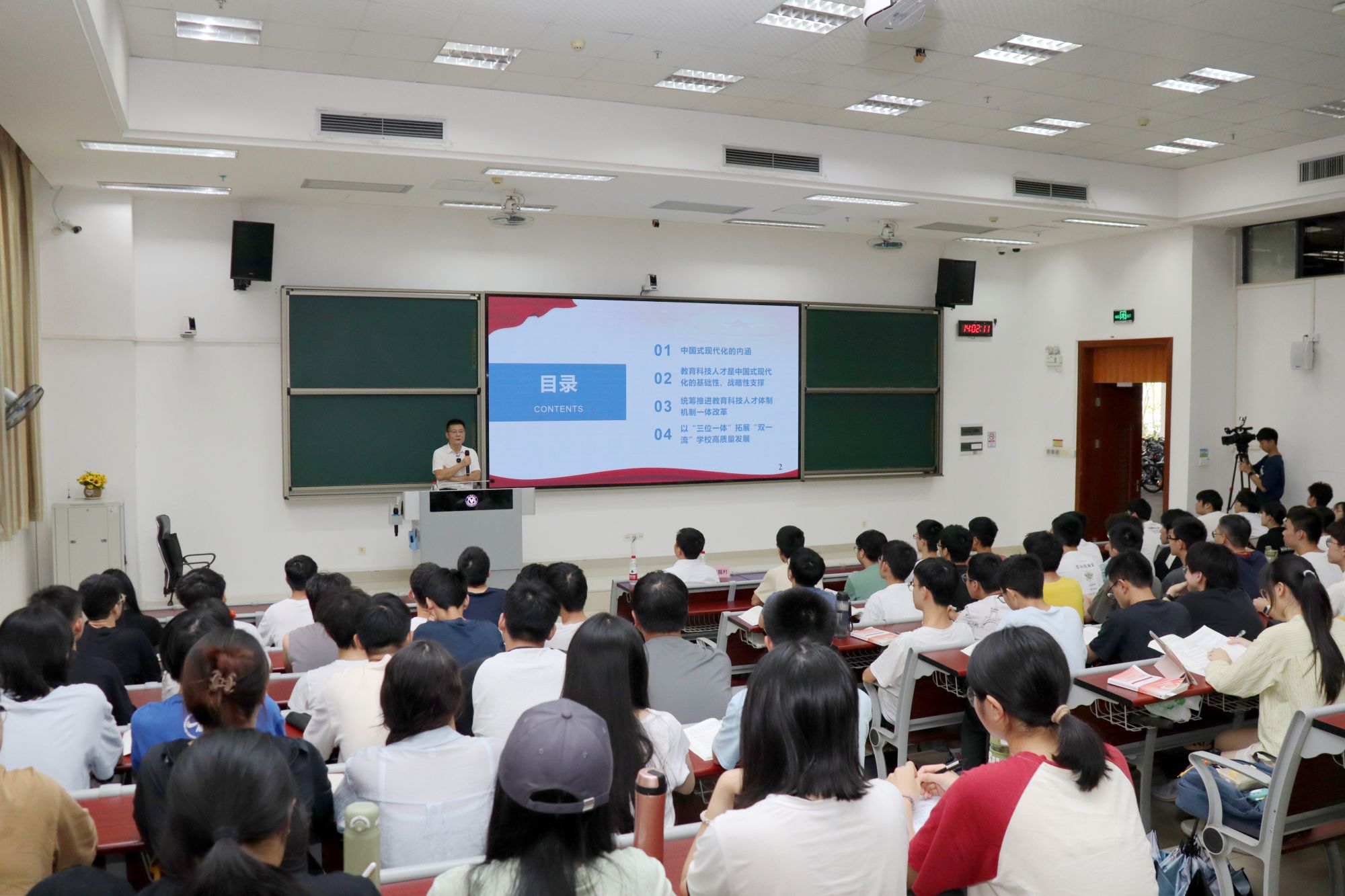 在题为“统筹教育科技人才‘三位一体’现代化建设 开拓‘双一流’学校高质量发展新局面”的思政课上,校长赵醒村教授为同学们深入介绍中国式现代化的内涵,阐述教育科技人才的基础性、战略性支撑作用,并勉励同学们传承广医人精神和南山精神,砥砺奋进,不断提升自己的能力和素质,在新时代新征程上作出新的更大贡献。