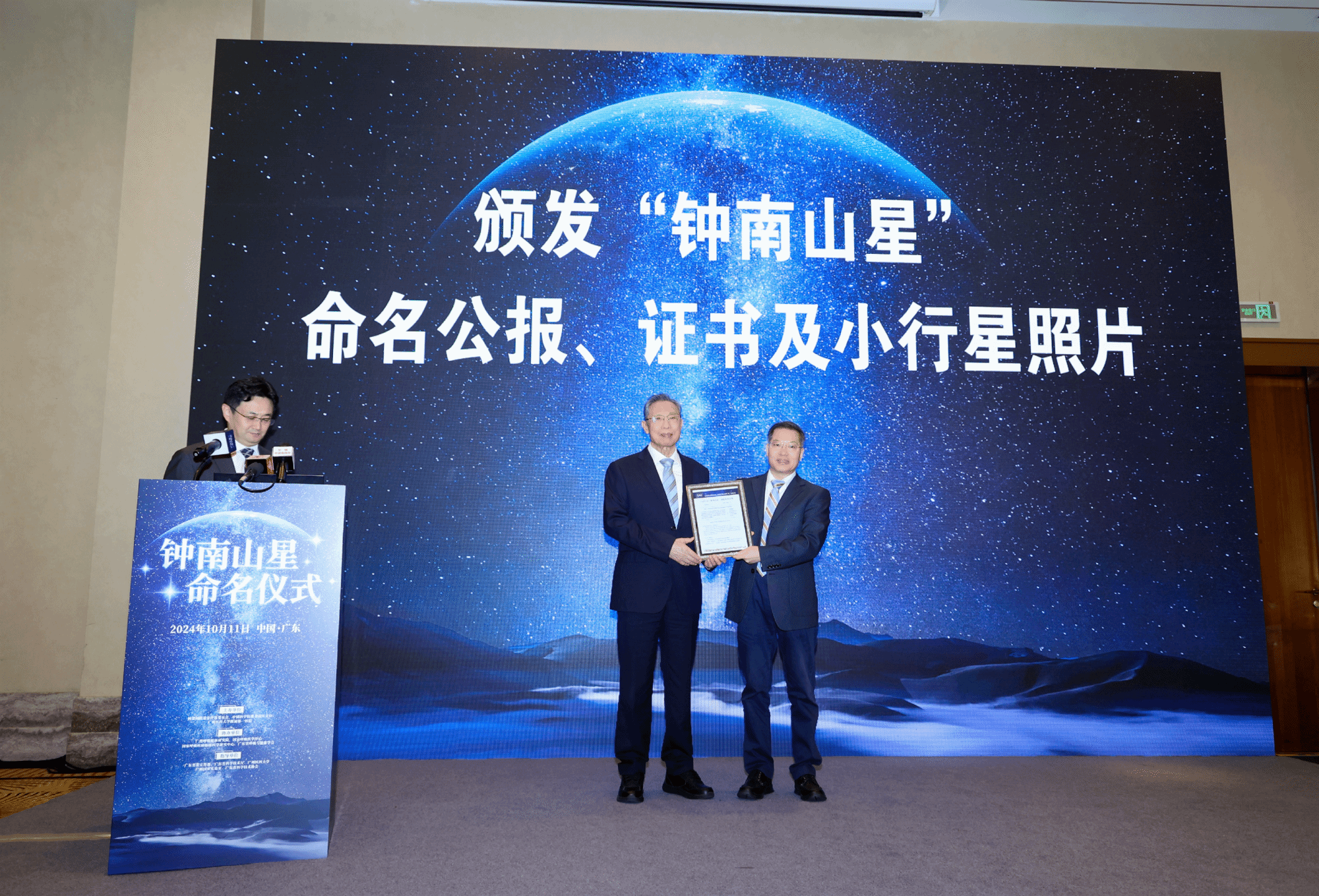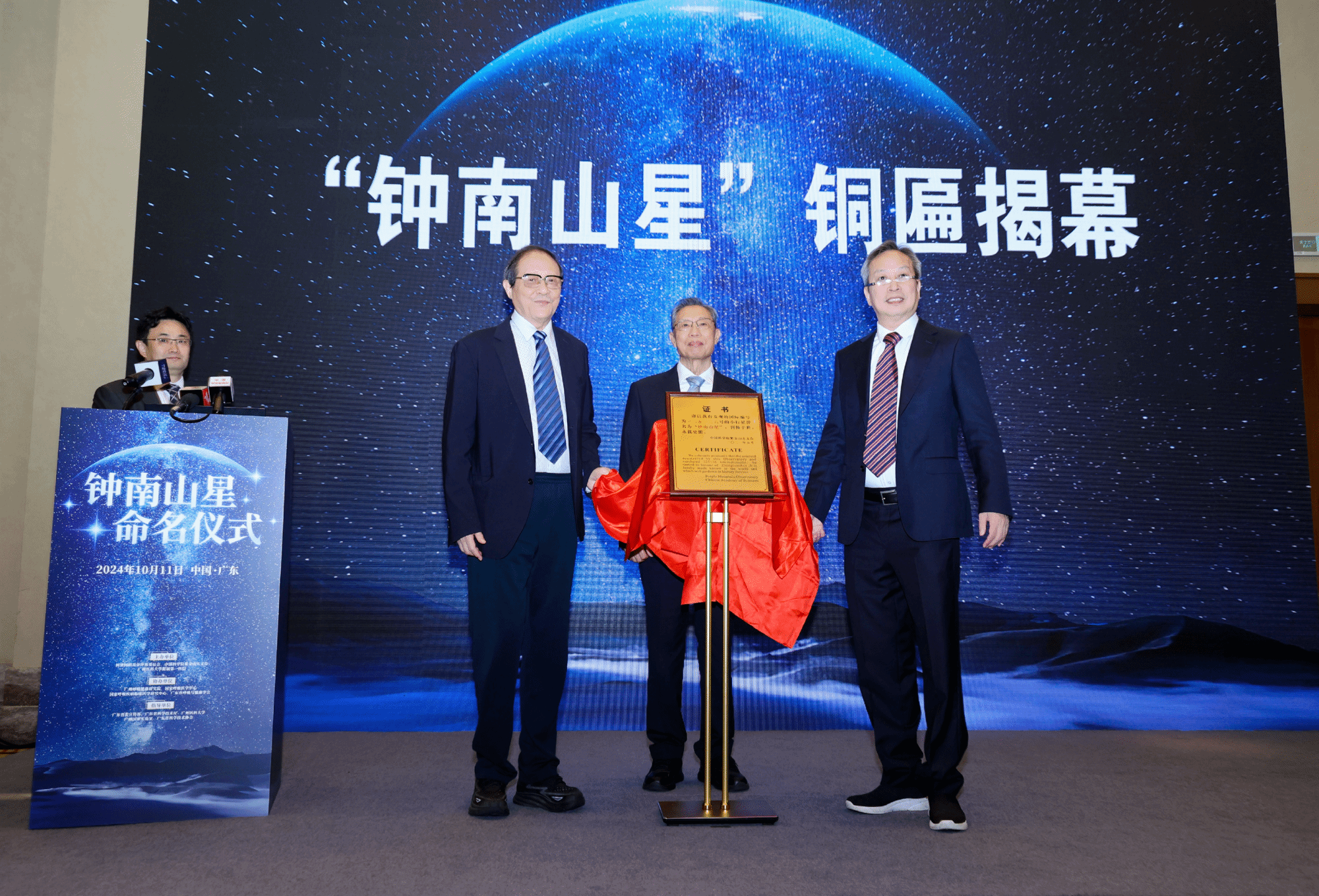 2024年10月11日,一个特别的命名仪式在珠海横琴举行——中国科学院紫金山天文台发现的编号为325136号的小行星被正式命名为“钟南山星”。这颗小行星的命名是为了表彰“共和国勋章”获得者、中国工程院院士钟南山在医学领域的卓越贡献,特别是他在呼吸系统疾病的研究、预防与治疗方面所作出的巨大努力和成就。