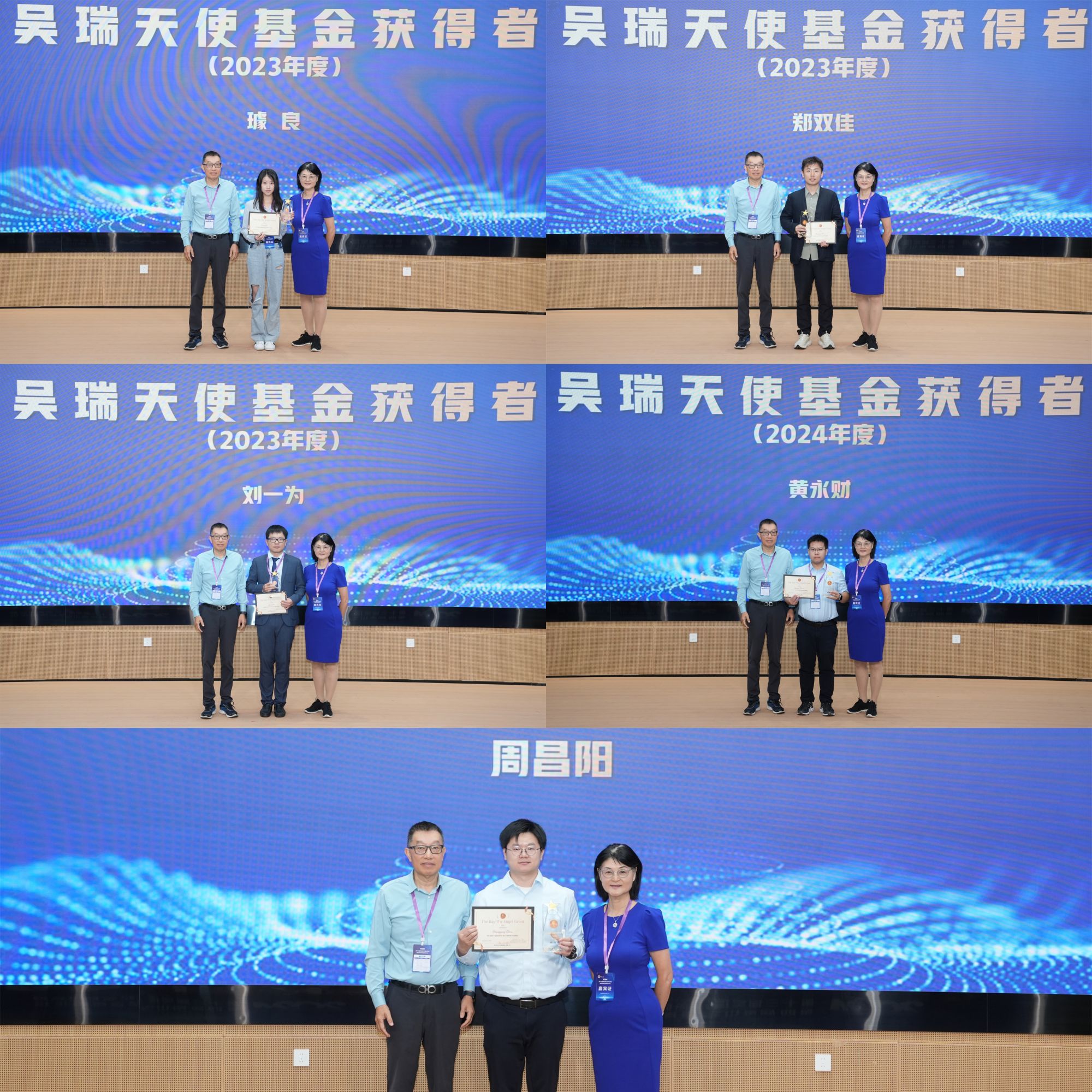 复旦大学璩良等5位研究者获2023/2024年度吴瑞天使基金,余国良博士、卫颖飞博士为获奖者颁奖。