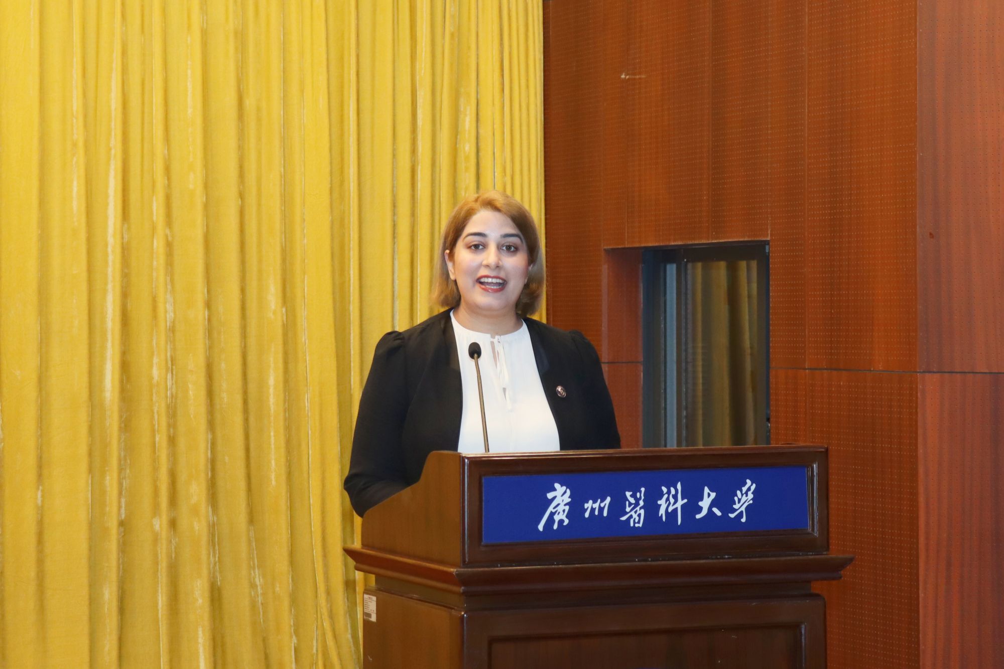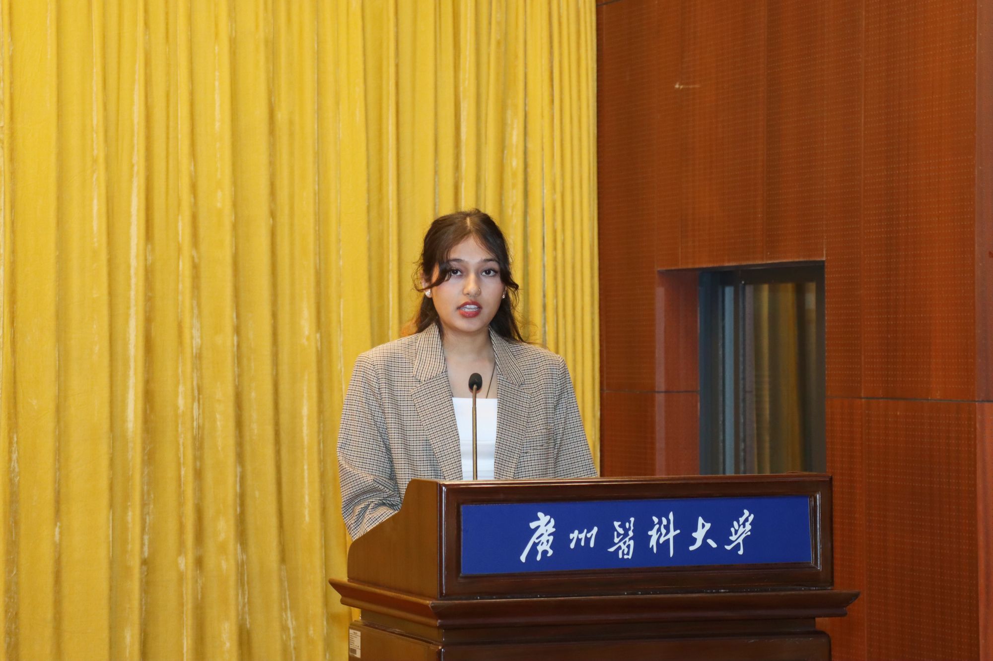 来自印度的2024级本科生RAWAT KHUSHI代表新生发言。她讲述了选择来中国学习的原因,并表达了对中国文化的浓厚兴趣和对广医校训“厚德修身,博学致远”的理解。她表示将利用在广医学习的机会,勤奋刻苦地钻研学问,为实现自己的医学梦想而努力。来自巴基斯坦的2023级硕士研究生SHAH NOOR UL HUDA代表在校生发言,已在广医学习生活八年的她,以自身求学经历为例,向新生们传授了如何制定有效的学习计划和学习掌握中文的宝贵经验,鼓励新同学们尽快适应校园的学习与生活环境,并祝愿大家在六年后以优异成绩顺利毕业。