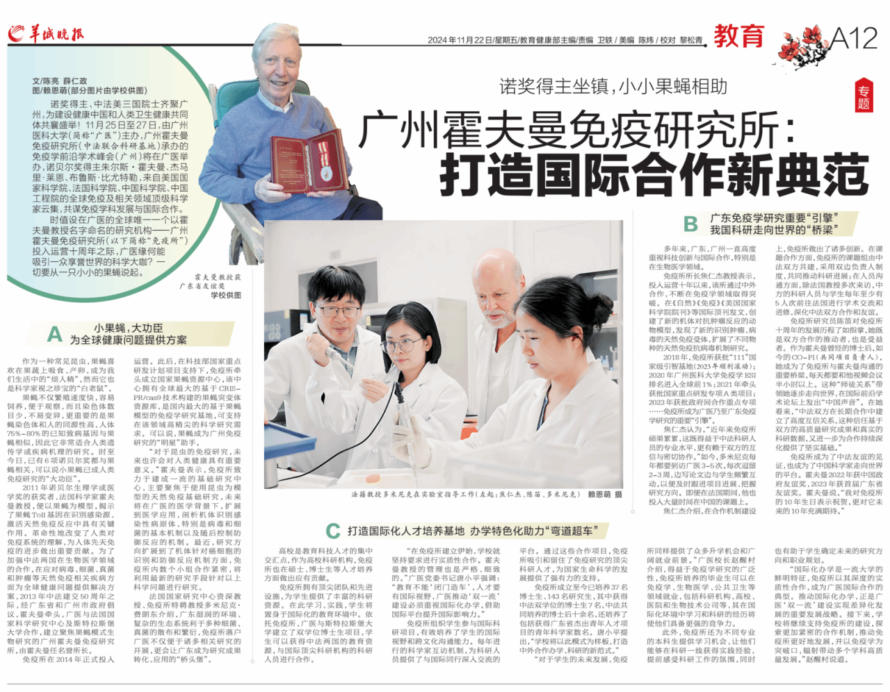 时值设在广医的全球唯一一个以霍夫曼教授名字命名的研究机构——广州霍夫曼免疫研究所(以下简称“免疫所”)投入运营十周年之际,广医缘何能吸引一众享誉世界的科学大咖?一切要从一只小小的果蝇说起。