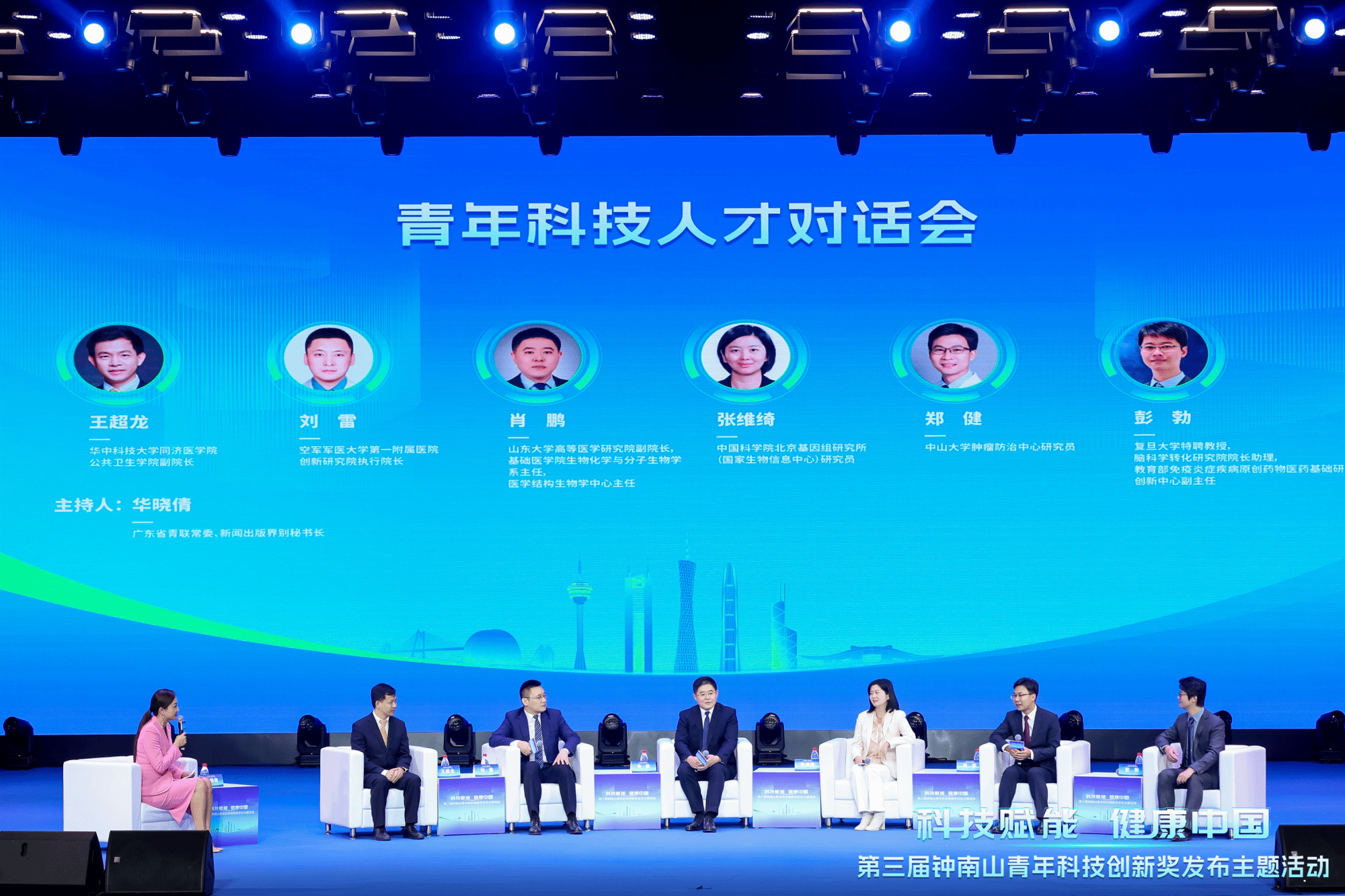在“主题分享·青年科技人才对话会”中,华中科技大学同济医学院公共卫生学院副院长王超龙,空军军医大学第一附属医院创新研究院执行院长刘雷,山东大学高等医学研究院副院长肖鹏,中国科学院北京基因组研究所(国家生物信息中心)研究员张维绮,中山大学肿瘤防治中心研究员郑健,复旦大学特聘教授彭勃围绕“科学研究对国家的建设及人类的影响”“如何坚持做科研的初心”等主题展开交流。