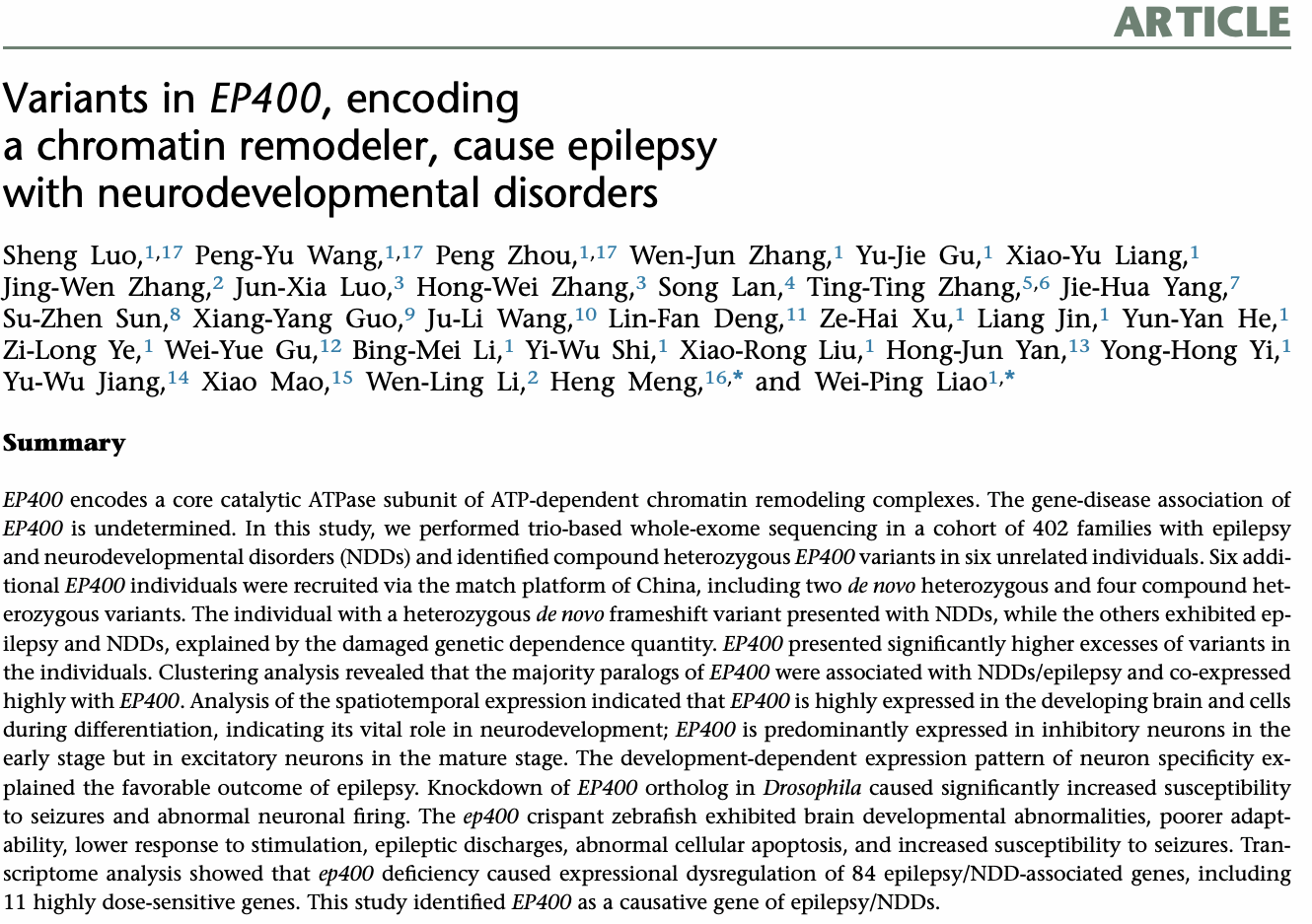 该研究从中国癫痫基因1.0项目中的癫痫伴有发育障碍病人的多中心队列中鉴定了12例携带EP400变异的病人。聚类分析显示EP400的旁系同源基因多与神经发育障碍相关。使用了果蝇和斑马鱼模型为进一步验证EP400与疾病的关联。敲低EP400的果蝇和斑马鱼模型复现了病人的癫痫和神经发育障碍表型。转录组分析显示EP400缺陷导致84个癫痫/NDD相关基因表达失调,其中包括11个高度剂量敏感的基因。这些发现为揭示EP400导致癫痫的机制提供了新的线索。