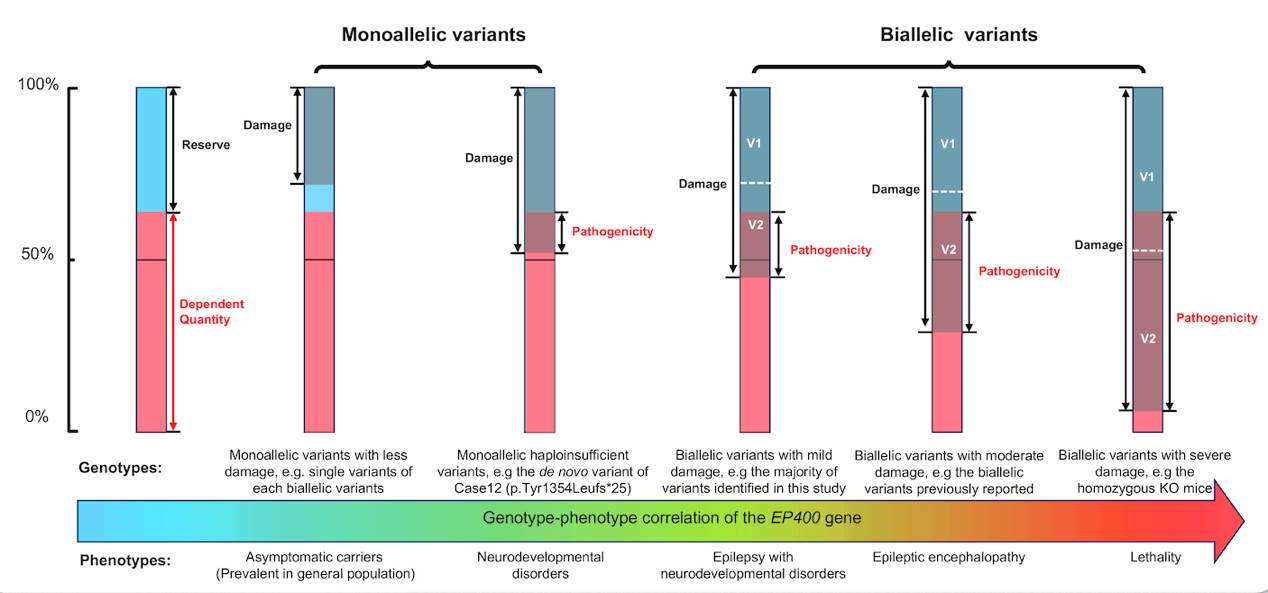 癫痫和神经发育障碍是一组严重影响患者生活质量的神经系统疾病,其与人类生命的早期发育密切相关。临床上,一部分病人表现为癫痫伴神经发育障碍,而另外一些病人仅表现为癫痫或神经发育障碍等其它异质的表型。这种表型异质性的机制尚不清楚,不能用传统孟德尔遗传学“有”或“无”的遗传理论解释。该研究基于基因量依赖学说,阐明了这种表型异质性的机制,为临床基因诊断和发现新致病基因提供了重要的理论基础。