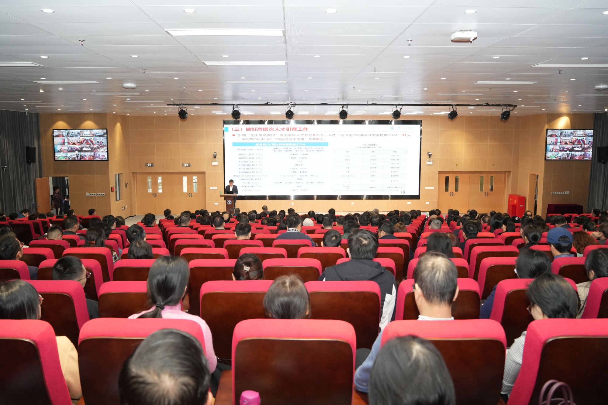 通报会在番禺校区设置主会场,在越秀校区和各附属医院设置分会场。全体校领导,学校全体中层干部,番禺校区管理八级及以上职员,副高职称及以上专业技术人员,学校教代会代表,南山学者代表在主会场参加会议。