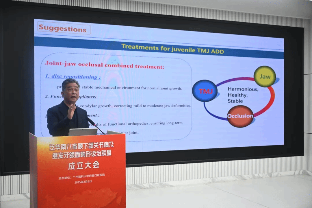 在学术交流环节,解放军总医院第一医学中心刘洪臣教授和上海交通大学医学院附属第九人民医院杨驰教授开展专题讲座。刘洪臣教授围绕颞下颌关节紊乱症、咬合病展开深入剖析。杨驰教授则聚焦于青少年颞下颌关节盘前移位的治疗理念,就此类患者是否进行关节盘复位进行了深入研究。