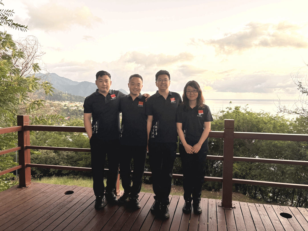 图为第7批援多米尼克中国医疗队队长、广医三院泌尿外科邓楠(右二)和队员广医二院眼科宋莉(右一)、麻醉科张续镤(左一)、广医一院心内科杜一鹏(左二),身穿广医文化衫在俯瞰多米尼克首都罗索的观景台上合影