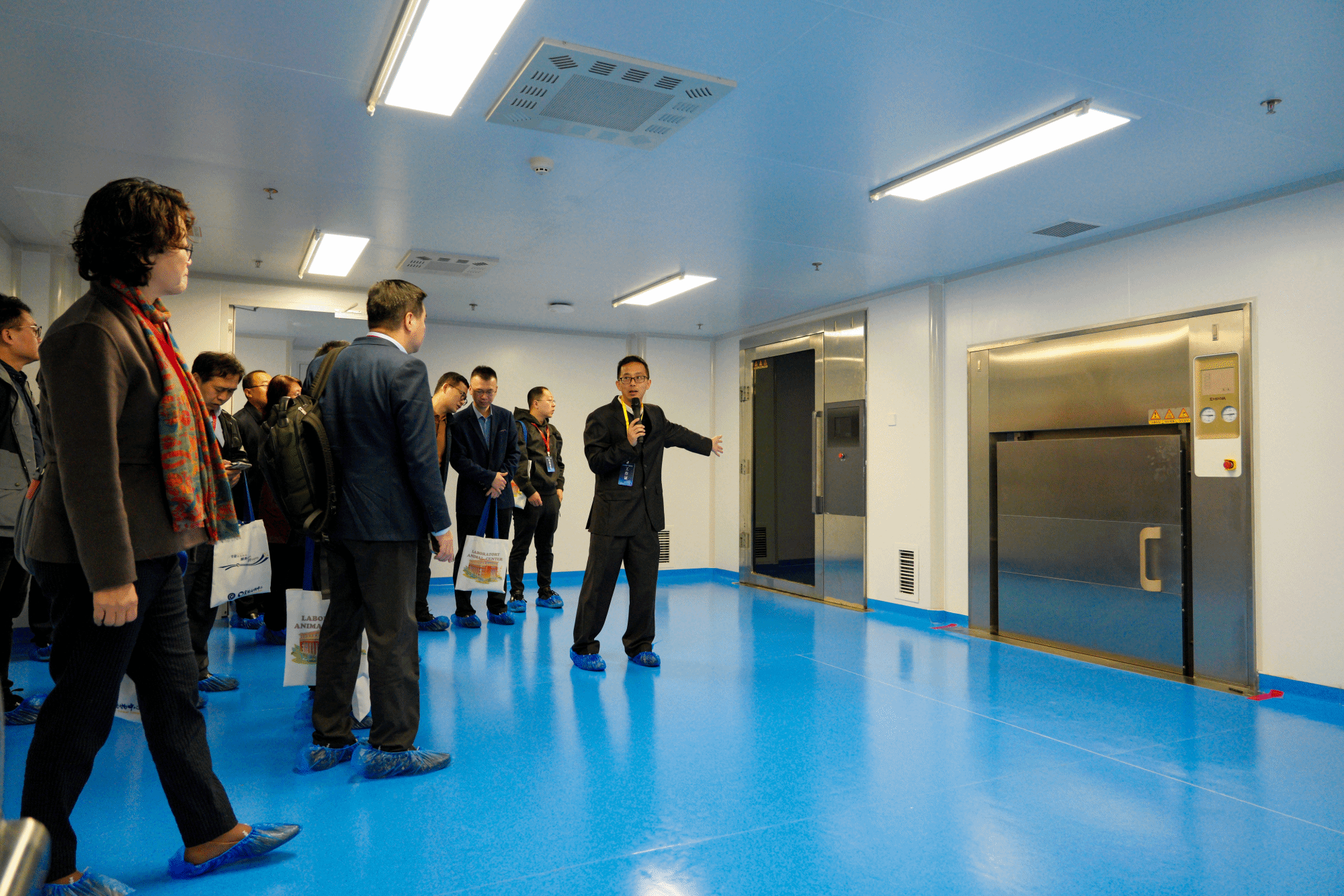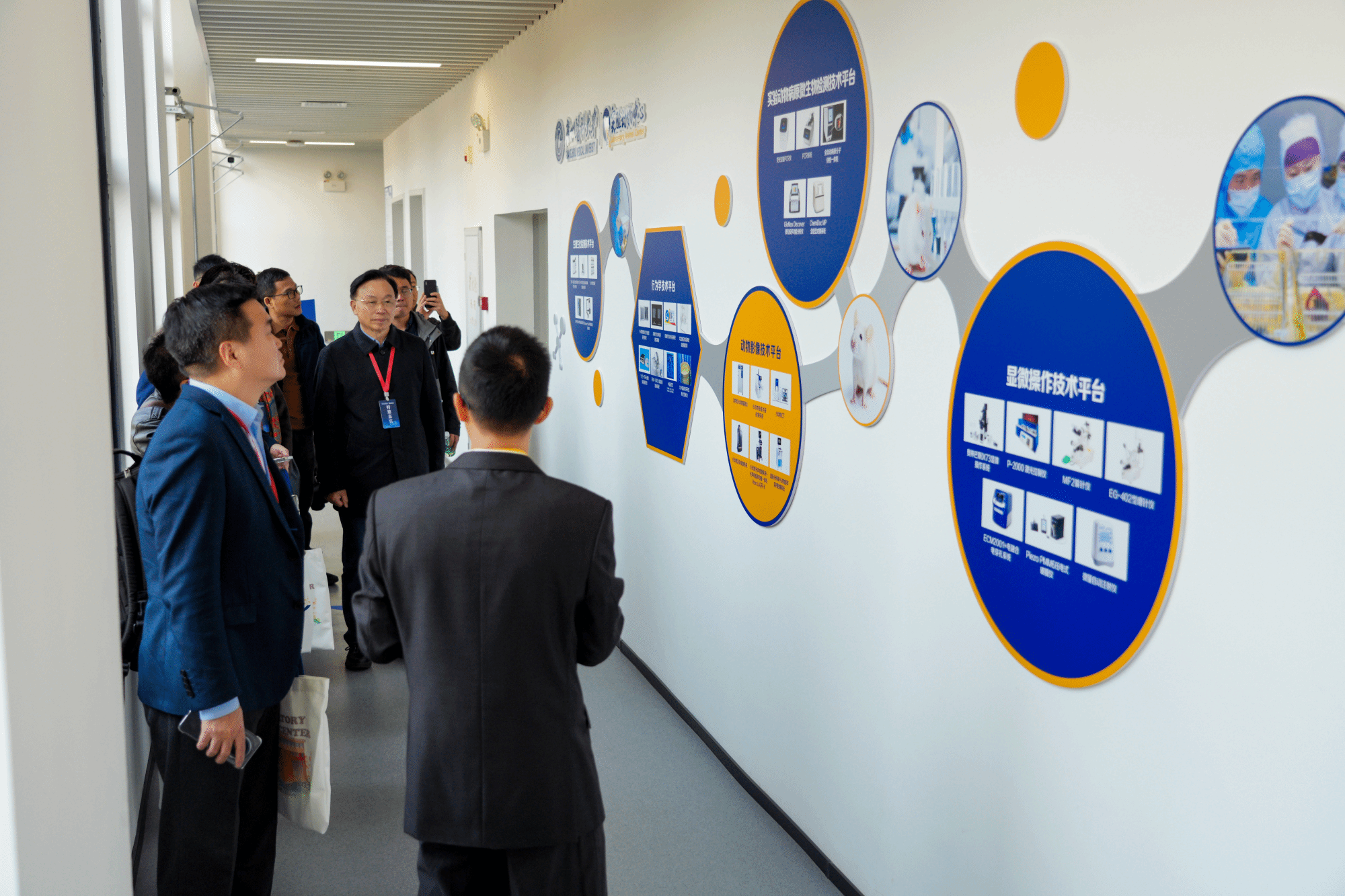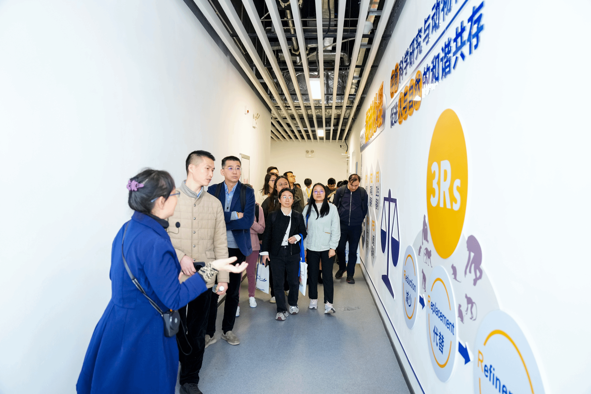 开幕式后,参会嘉宾分三组,沿不同路线参观实验动物中心二期屏障内外设施。通过近距离观察独立通风笼具(IVC)系统、步入式洗笼机、脉动真空灭菌器、隧道式洗笼机、氙光传递窗等先进设备的运行,参会嘉宾了解了实验动物设施运行的标准化管理流程,并对生物安全文化长廊、实验动物福利伦理科普区和六大技术服务平台展示区等文化墙的布置表示肯定。