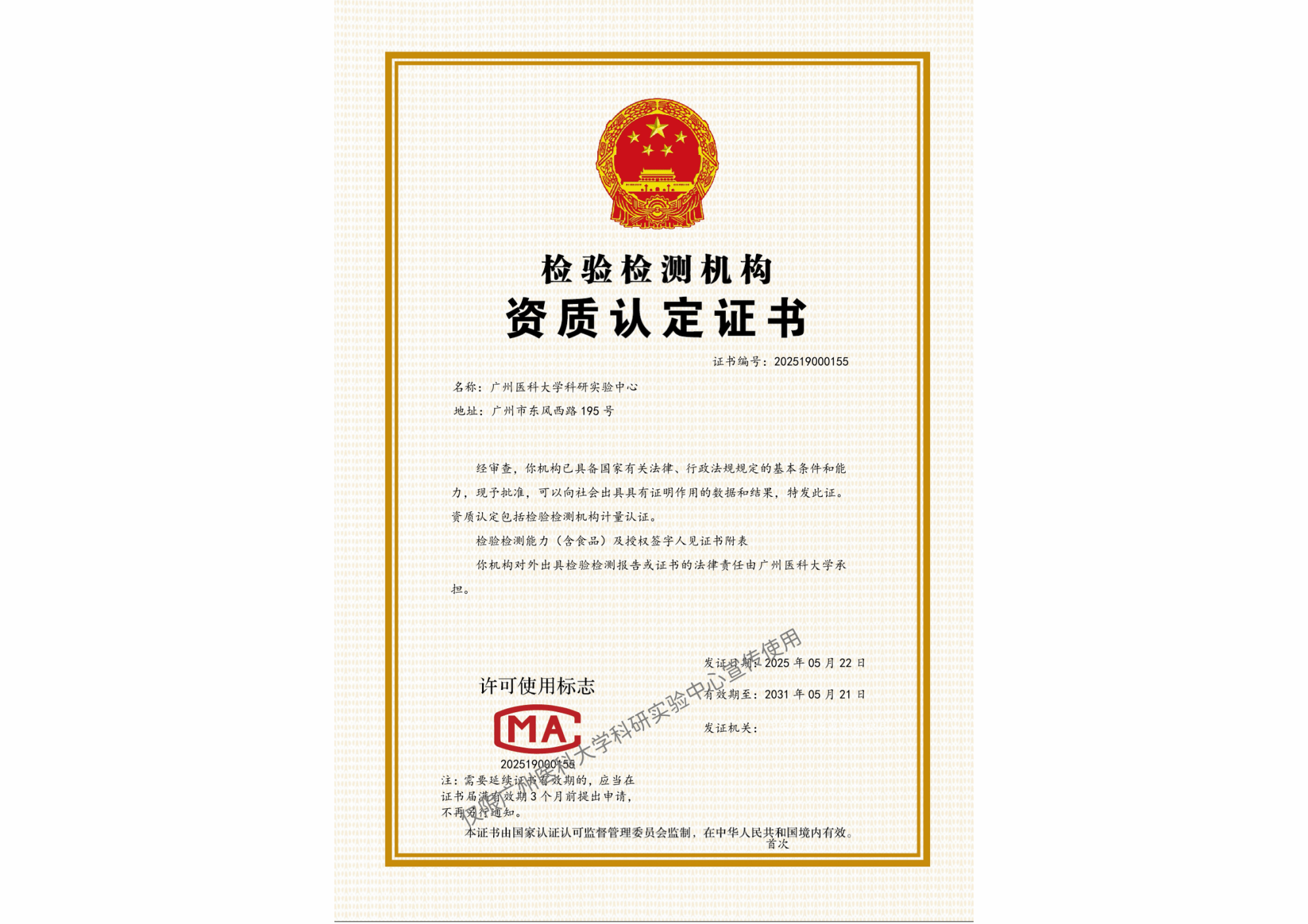 CMA是中国计量认证(China Inspection Body and Laboratory Mandatory Approval)的简称,又称检验检测机构资质认定。获得该项资质,标志着科研实验中心具备了向社会出具具有法律效力的检测数据和结果的能力条件,可以提供权威的检测服务,对科研实验中心检测质量和水平的提升具有重要意义。中心将继续发挥技术领先的专业优势,不断优化自身核心竞争力,提升管理体系和检验检测综合能力,为校内外各类研究机构和社会组织提供高效、稳定、可靠的检测服务,助力学校教学科研事业高质量发展。