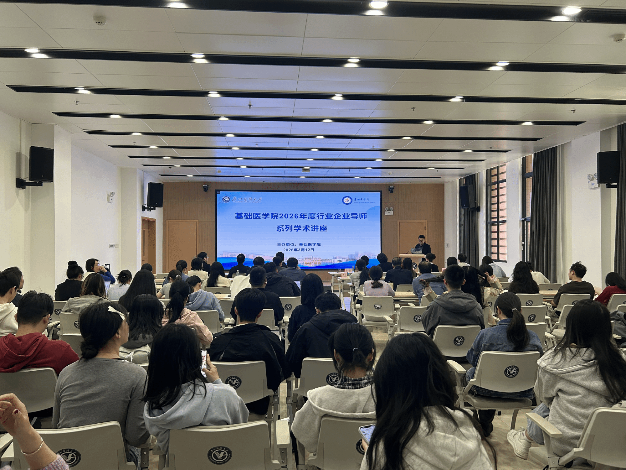 基础医学院有关负责人以及学院百余名师生代表参加学术讲座和交流活动。
