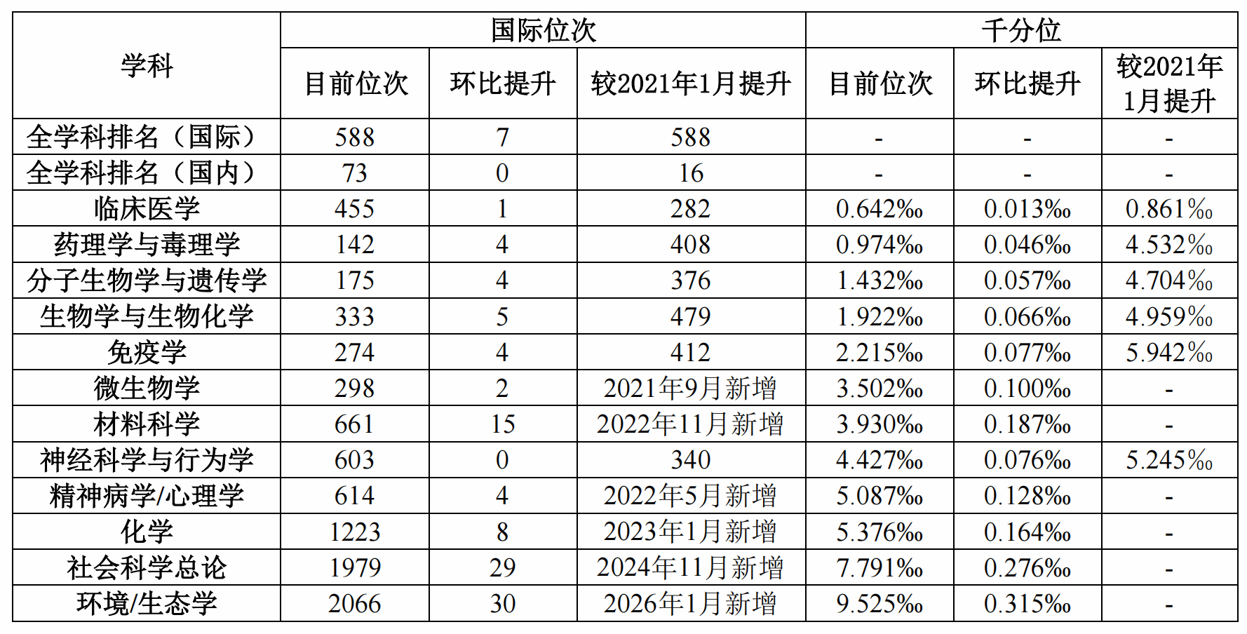在本期榜单中,我校全球综合排名位列第588位,较2021年初上升588位;国内高校排名位列第73位,较2021年初提升16位。学科表现方面,临床医学位居全球第455位,较2021年提升282位,千分位进入0.642‰;药理学与毒理学全球千分位为0.974‰。此外,分子生物学与遗传学(1.432‰)、生物学与生物化学(1.922‰)、免疫学(2.215‰)、微生物学(3.502‰)、材料科学(3.930‰)、神经科学与行为学(4.427‰)等6个学科也进入了全球前5‰行列,各学科齐头并进、稳步提升,彰显出学校多学科协调融合发展的良好态势。