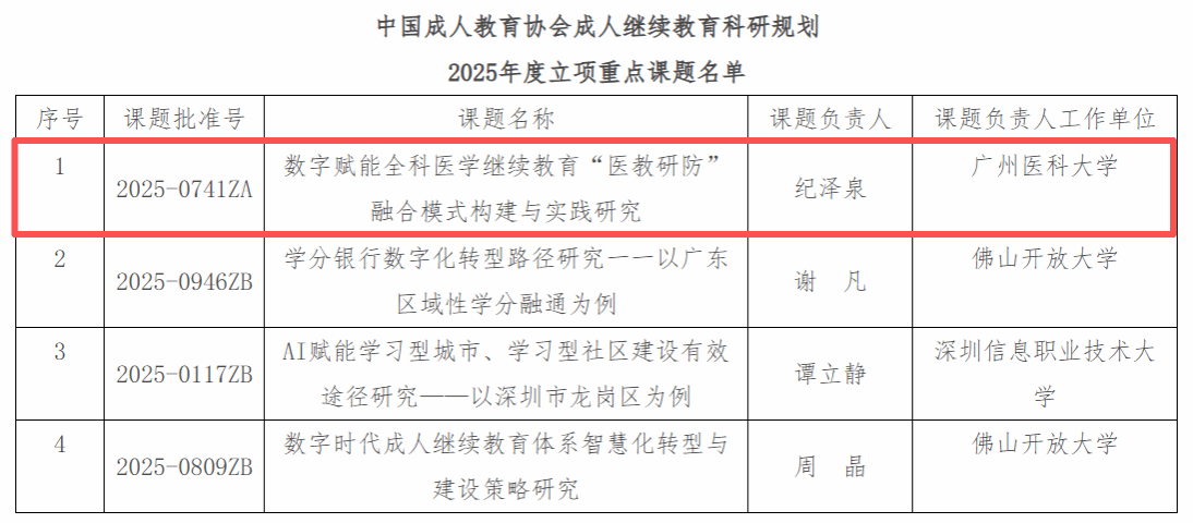 根据中国成人教育协会公布的2025年度成人继续教育科研规划课题立项结果,我校全科医学与继续教育学院院长纪泽泉教授负责的《数字赋能全科医学继续教育“医教研防”融合模式构建与实践研究》课题,获批重点A类立项,该类别全国仅40个课题获批立项。
