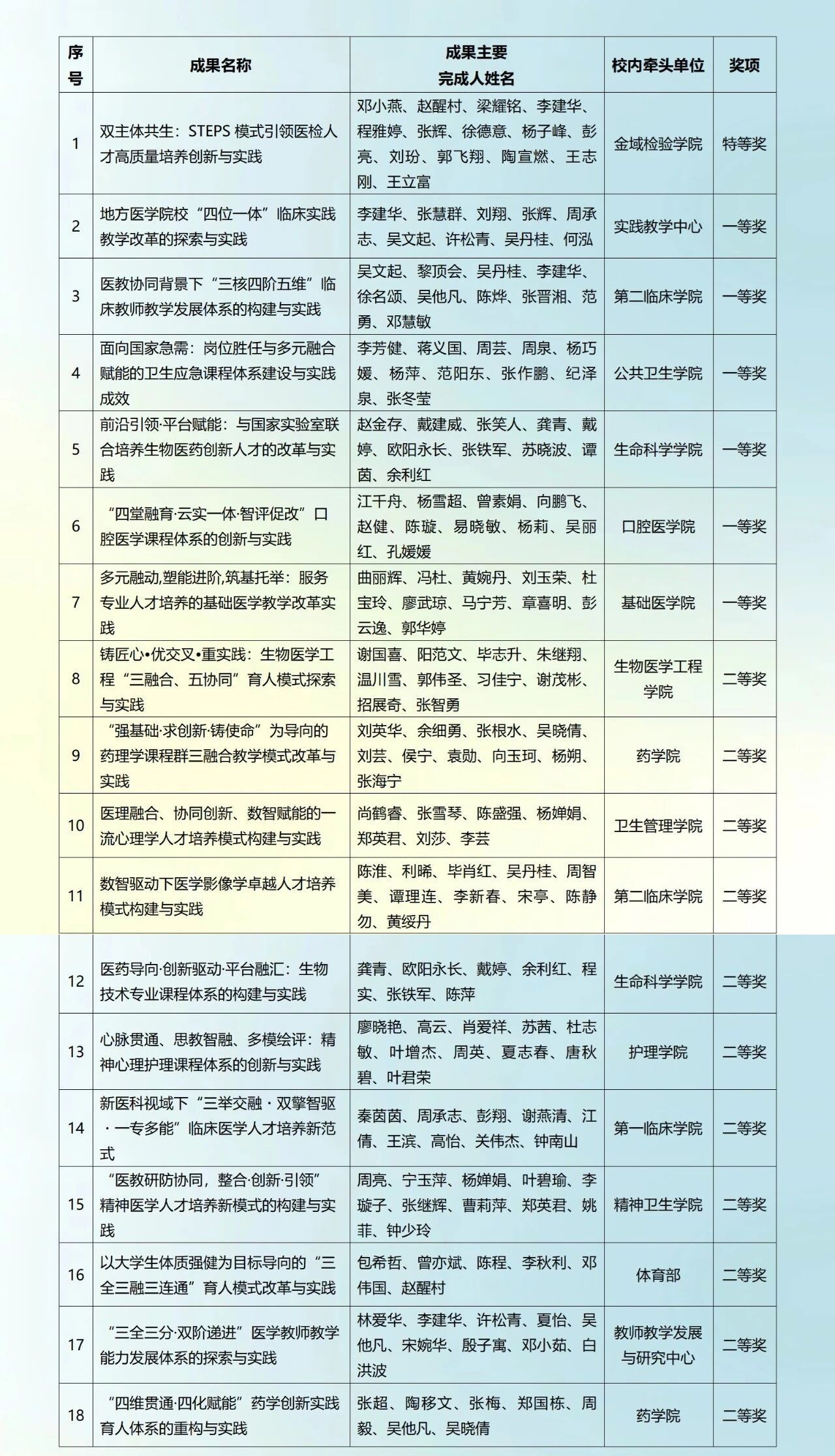 广东省优秀教学成果奖是我省教育教学领域的最高荣誉之一,是检验学校教学改革成效、衡量人才培养质量的重要标尺。我校此次获奖成果覆盖面广、创新性强,涵盖医学检验技术、临床医学、基础医学、公共卫生、药学、生物医学工程、护理学、精神医学、教师发展等多个优势领域,集中展现近年来学校在教育教学改革、人才培养模式创新、“新医科”建设以及课程体系构建等方面取得的扎实成效与显著突破,彰显学校“以本为本、以学生为中心”的教育理念,以及服务国家战略、赋能区域发展的责任担当。