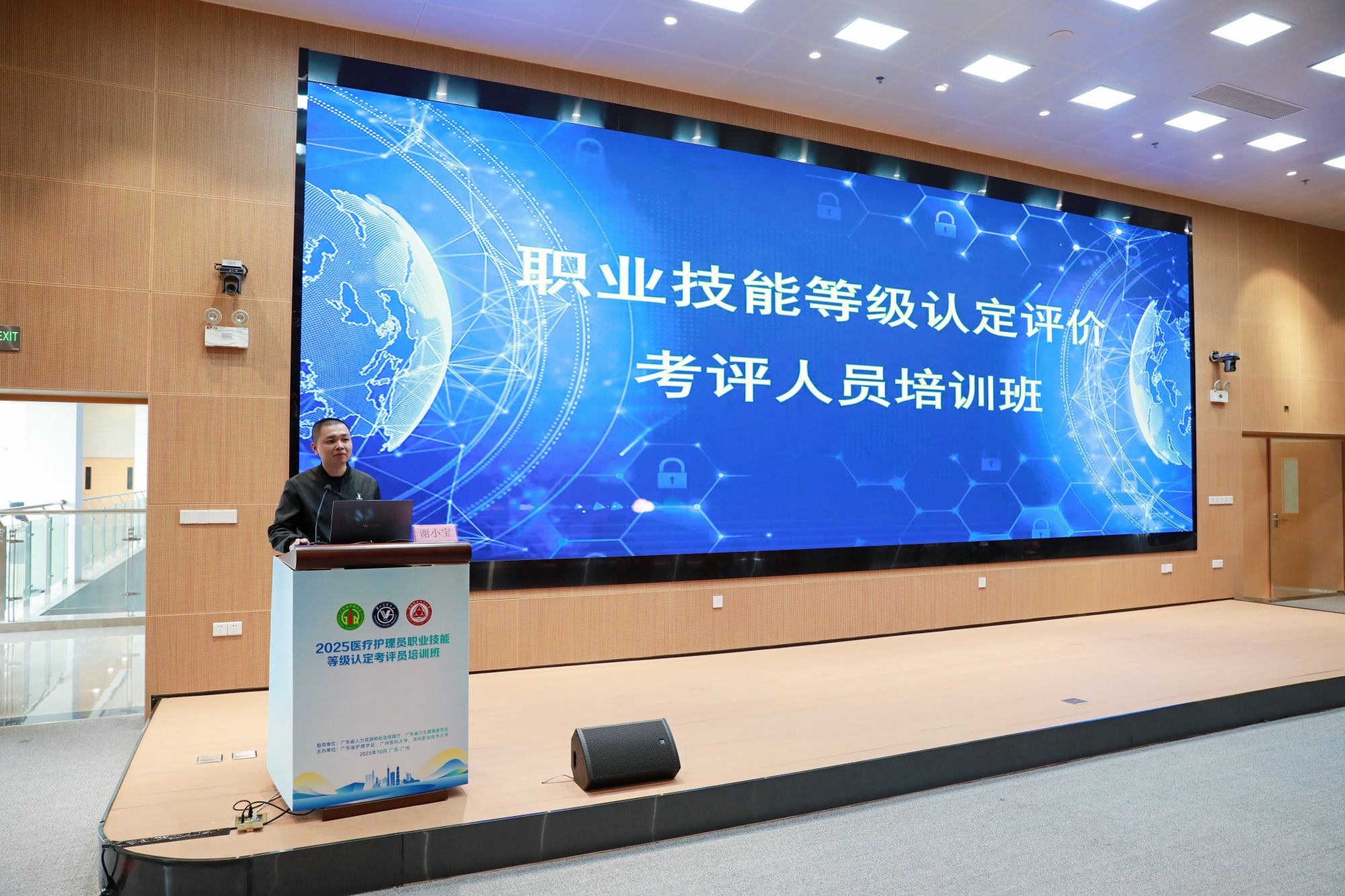 为贯彻落实国家及广东省关于职业技能等级认定工作的政策部署,加强医疗护理员考评员队伍建设,10月25日至26日,由广东省人力资源和社会保障厅、广东省卫生健康委员会指导,Beat365中文官方网站联合广东省护理学会、深圳职业技术大学主办的 “2025年医疗护理员职业技能等级认定考评员培训班” 在我校番禺校区举办。