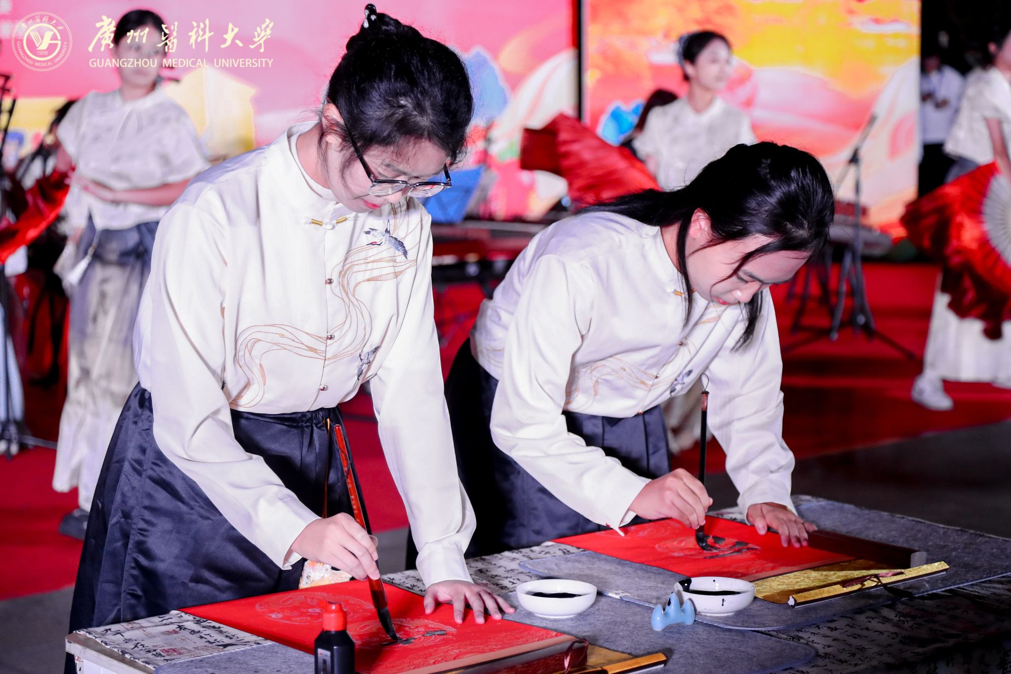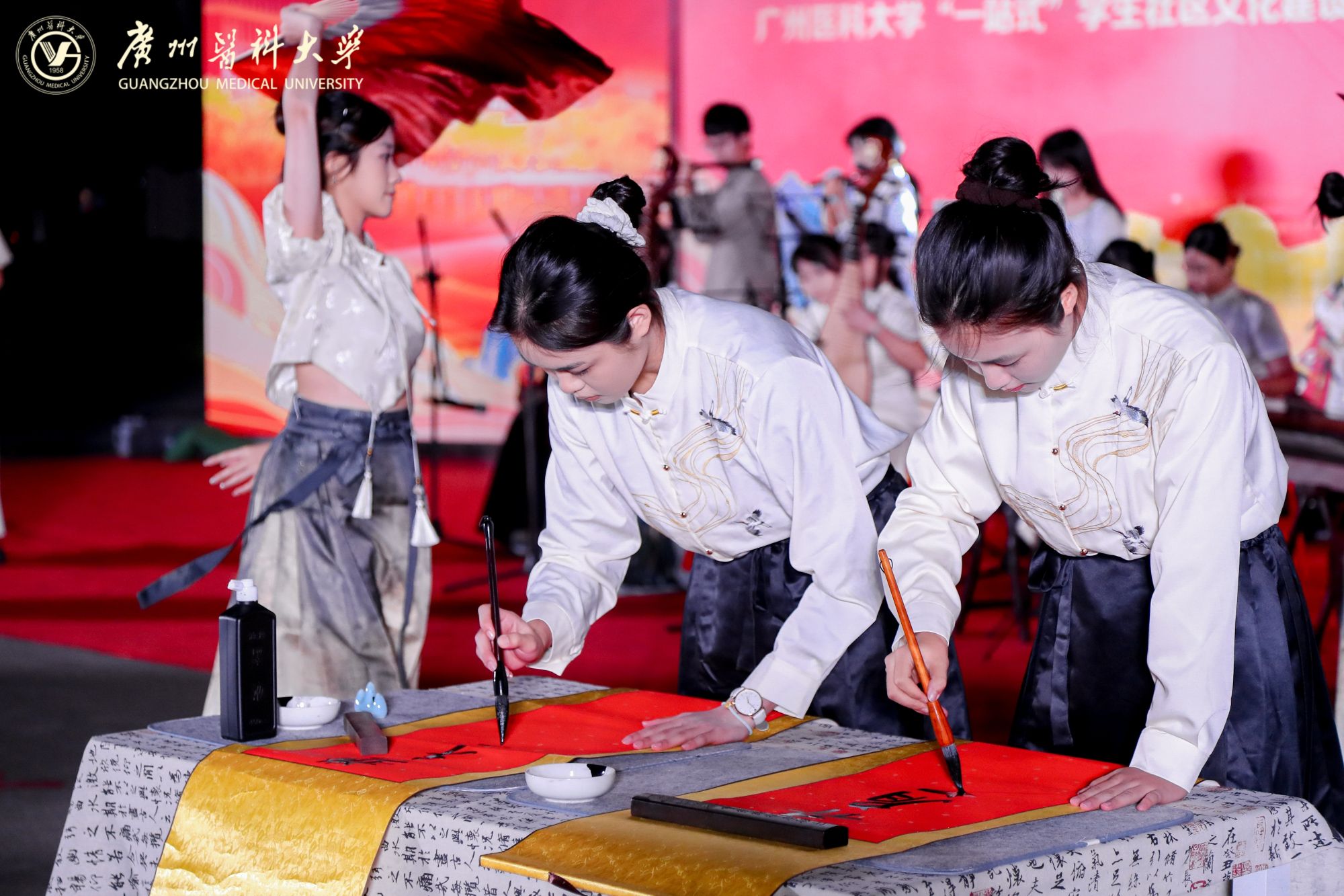 第二临床学院携手校民乐队、翰墨书画社共同呈现书法表演《同心共筑中国梦》,将文化底蕴与时代情怀巧妙相融。演出现场,民乐悠扬、舞姿翩跹,翰墨书画社的指导老师带领同学们泼墨挥毫,笔走龙蛇。