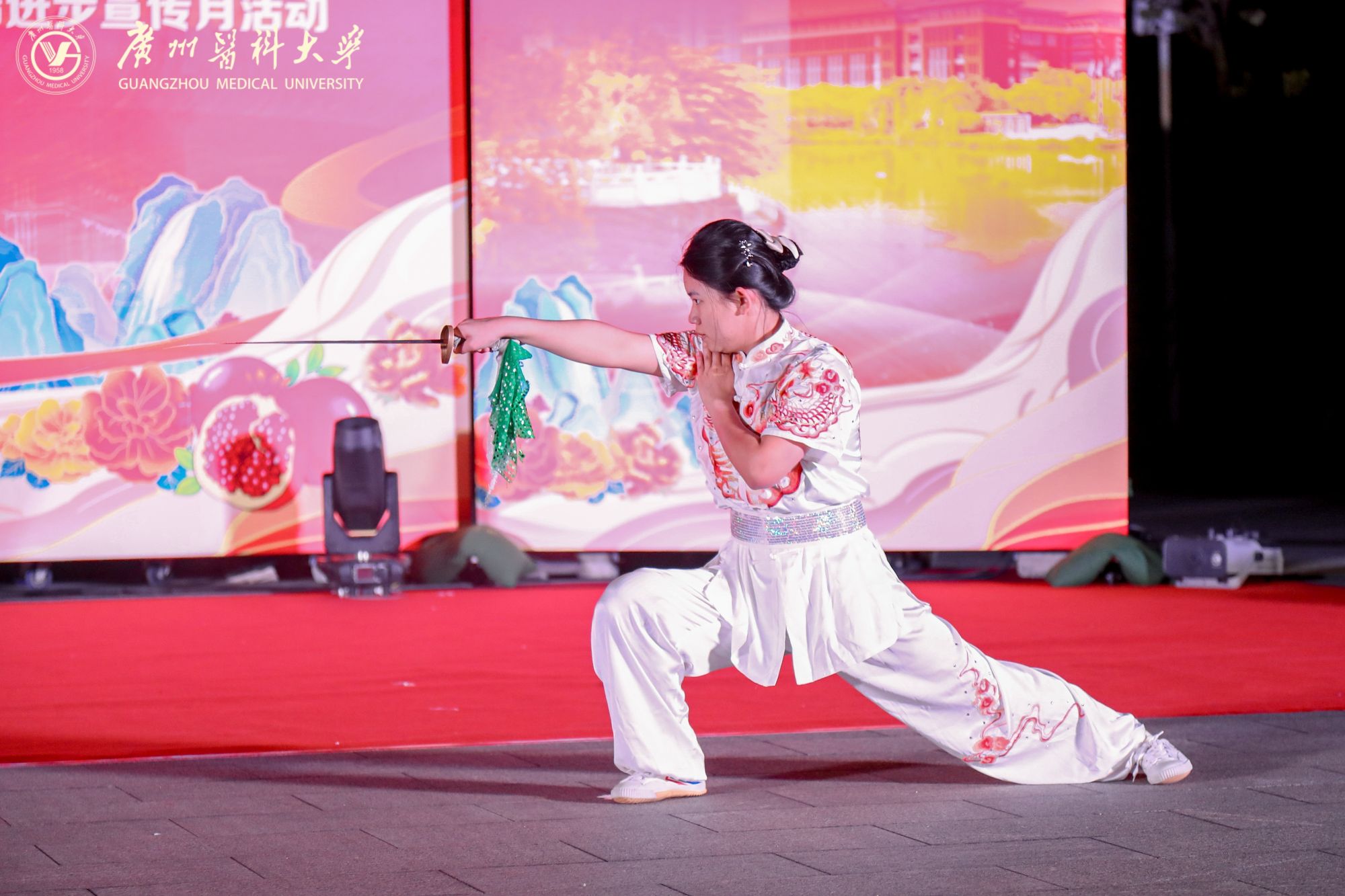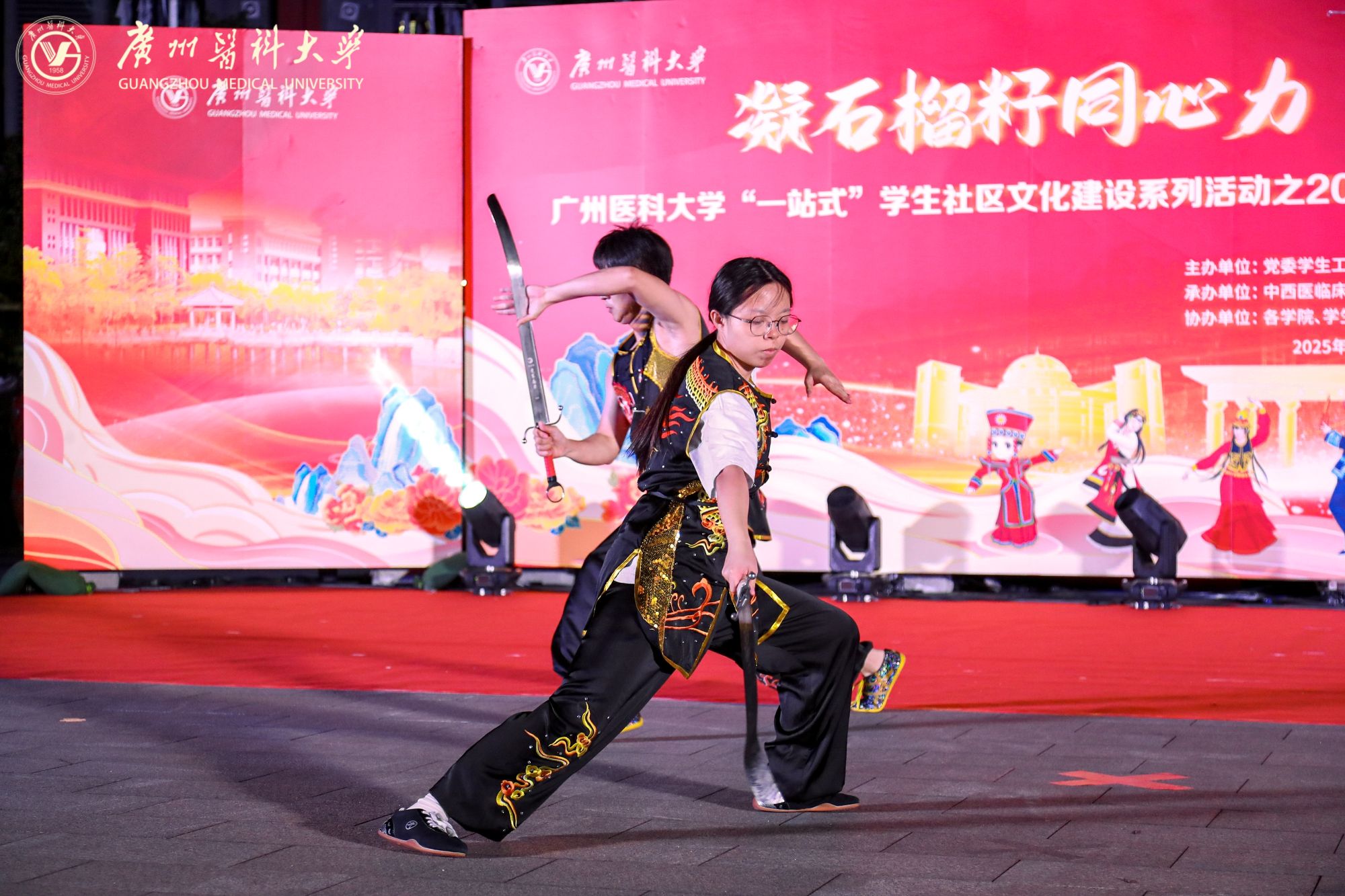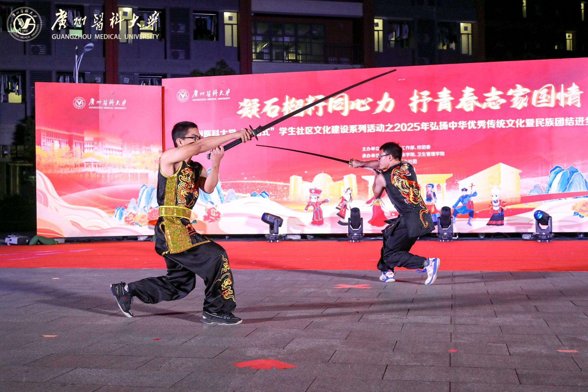 中西医临床学院与校武术队带来武术展演《武动民族魂》,南刀的迅猛凌厉、苗刀的霸气灵动、太极剑的飘逸沉稳与北刀的雄浑刚劲完美融合,传递自强不息的精神。