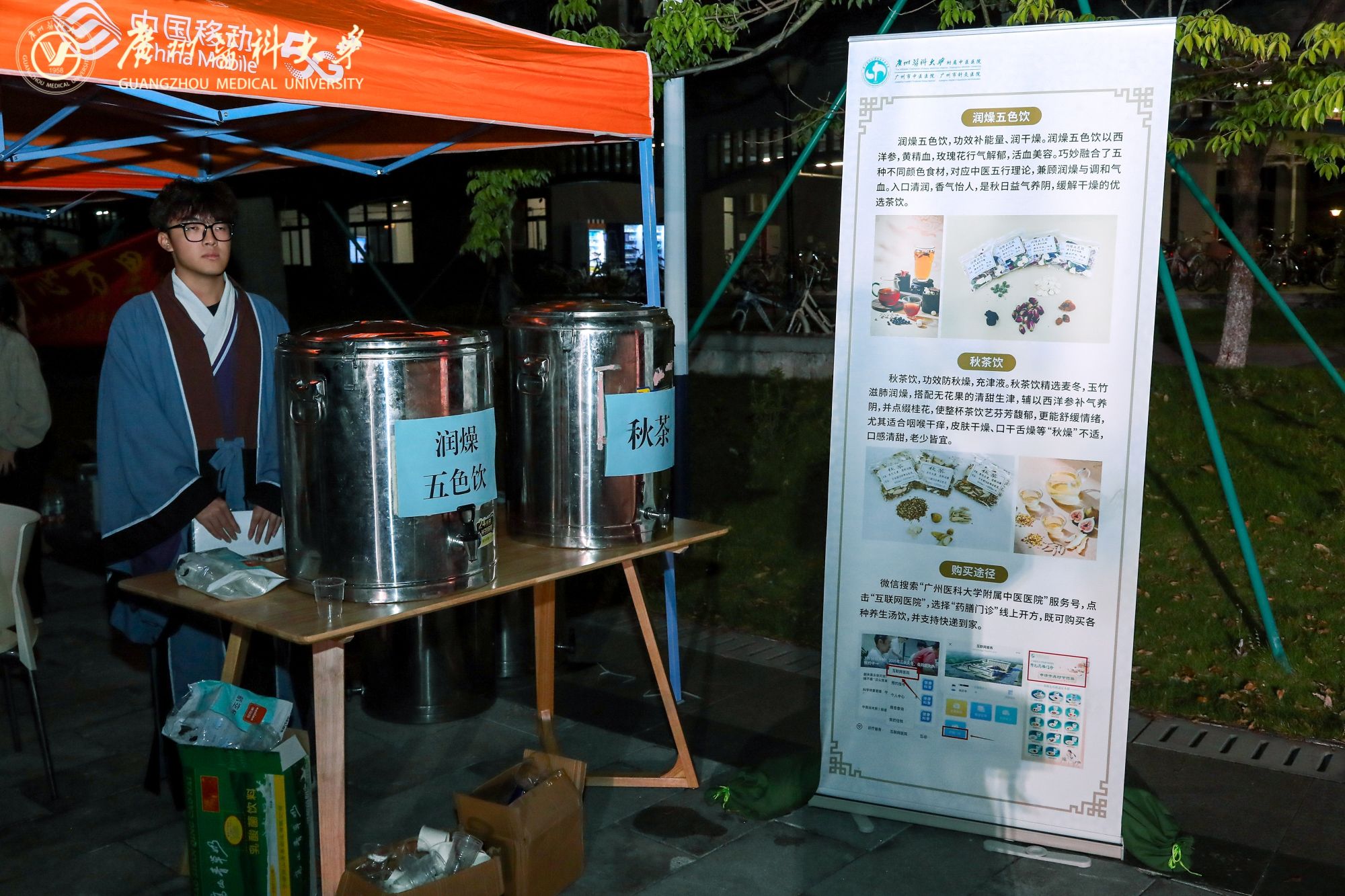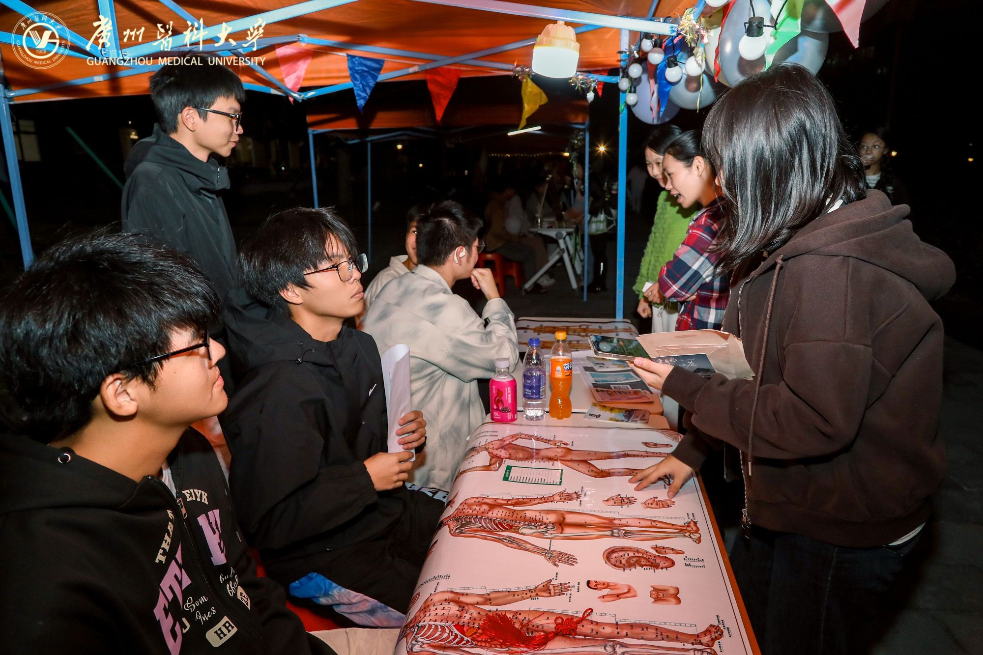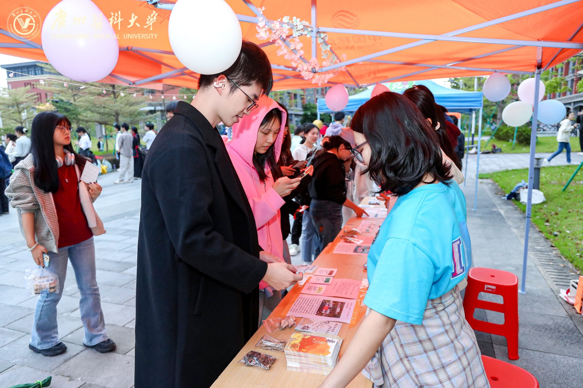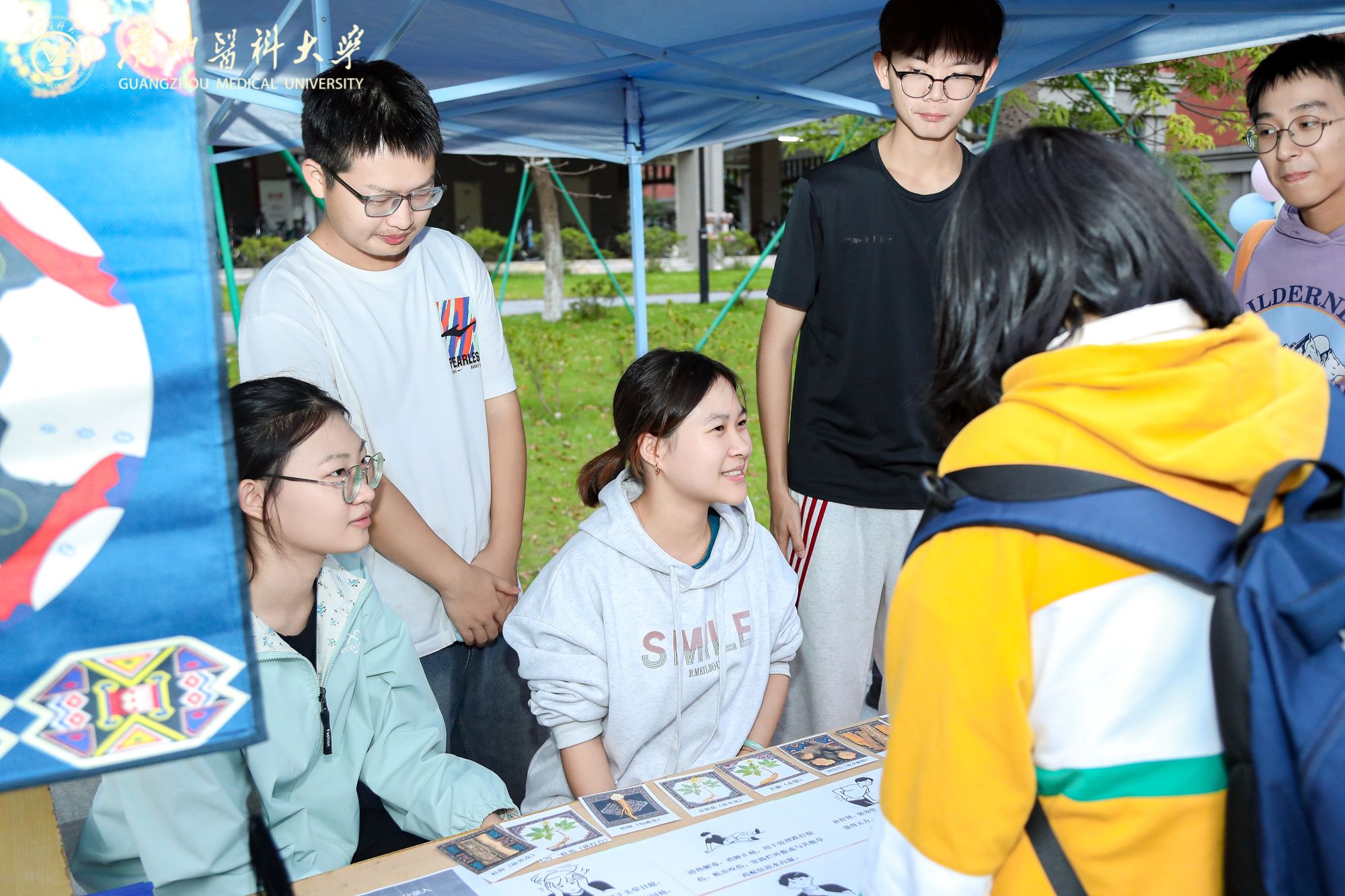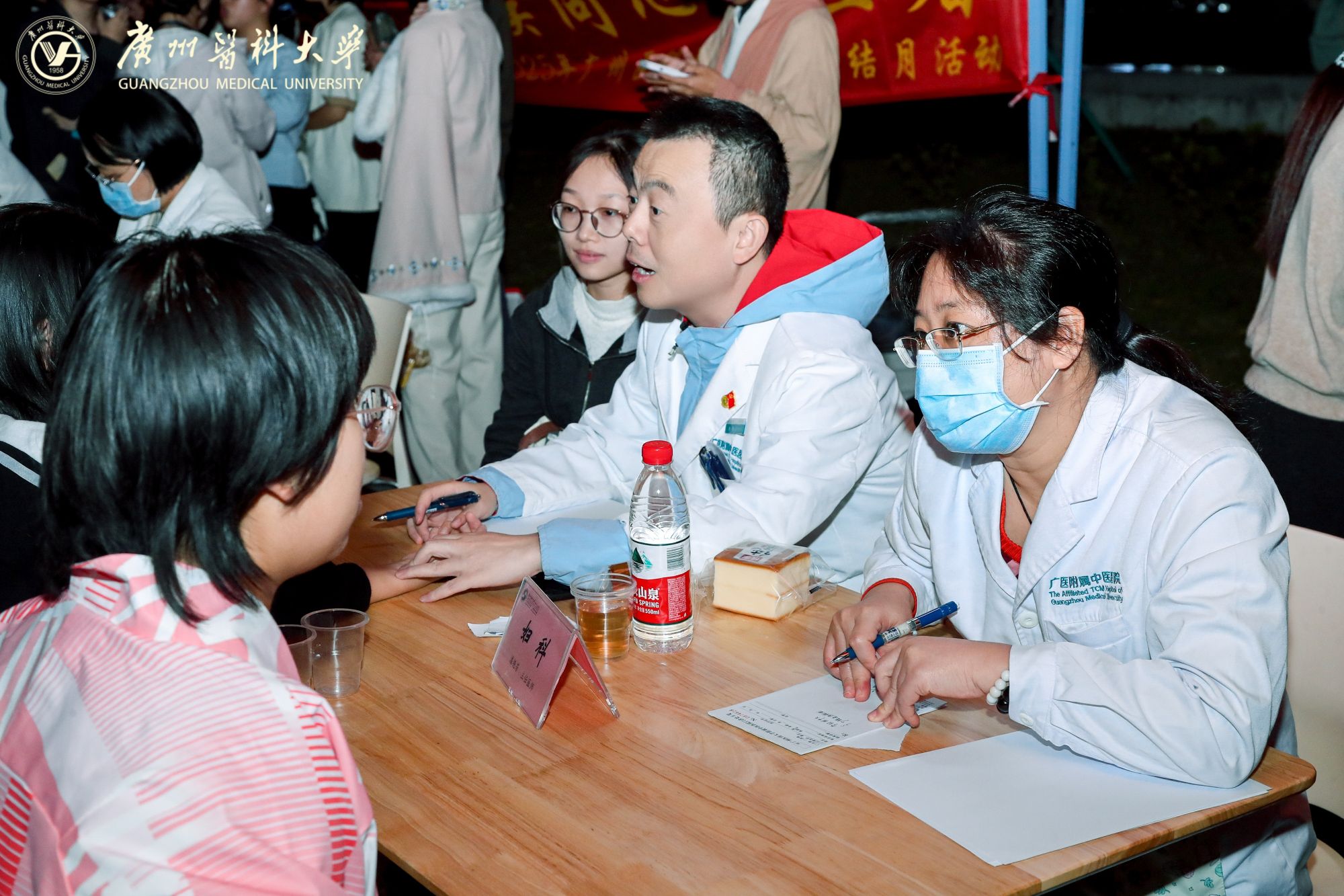 摊位后方,来自Beat365中文官方网站附属中医医院的医生坐镇中医义诊区。资深医师耐心地为前来咨询的同学们望闻问切,提供健康调养的专业建议,传播博大精深的中医药文化。