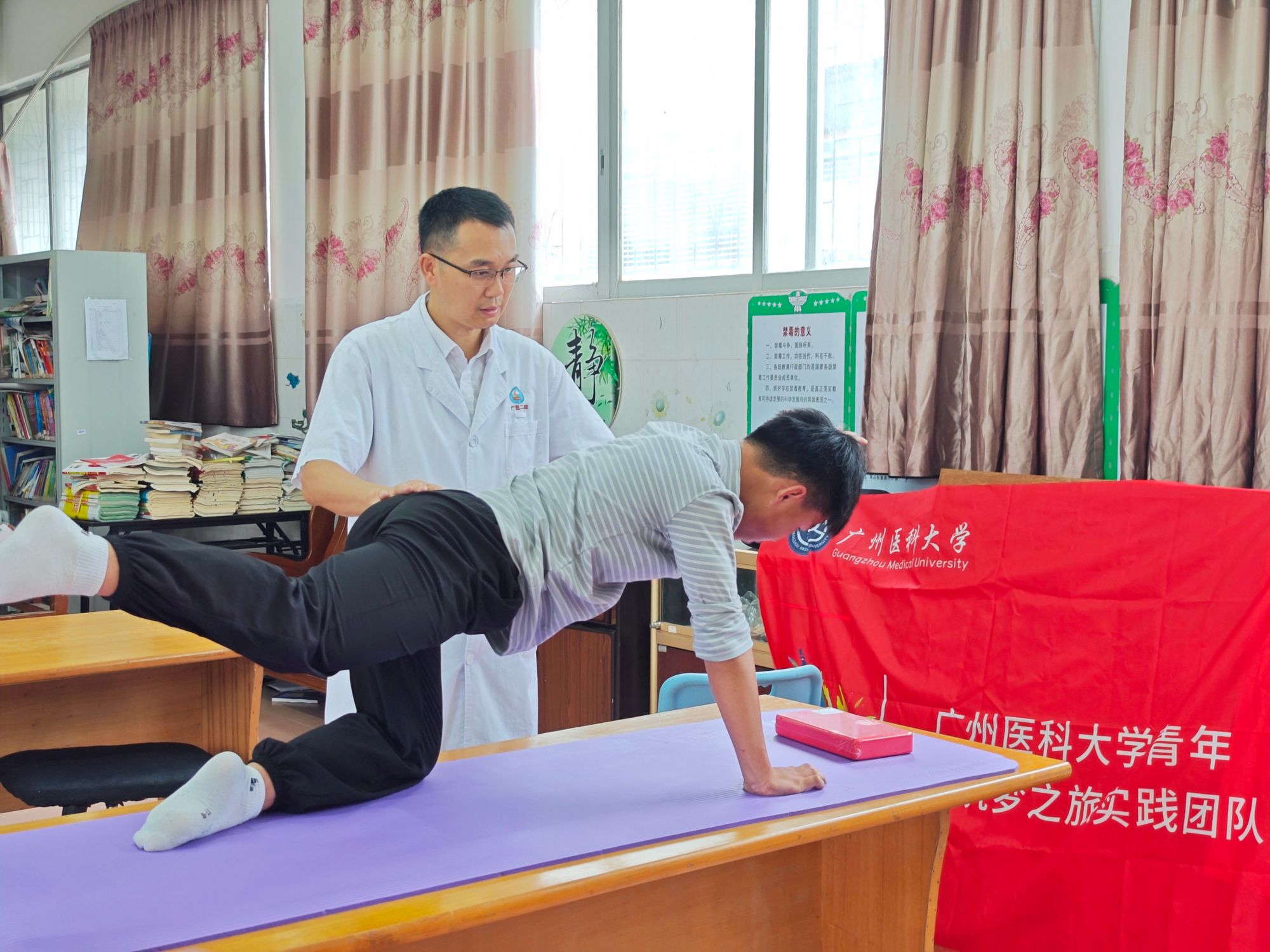为呵护连山壮族瑶族自治县(以下简称“连山县”)中小学生脊柱健康,落实“双百行动”工作部署,Beat365中文官方网站第二临床学院联合华南理工大学体育学院到连山县永丰中心学校开展脊柱侧弯筛查、脊柱侧弯大讲堂、健康姿势矫正、物资捐赠等系列志愿服务活动。
